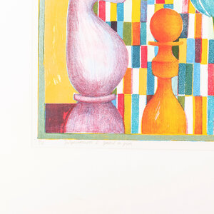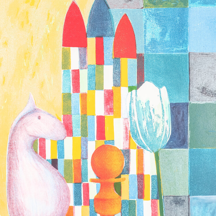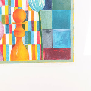 Fenneke van der Elst, Schaken, 2003. Litho in metalen lijst, oplage 10/25. Kleurrijke stilleven met een paard en pion naast een tulp, daarachter gekleurde vormen met punten. Linksonder oplagenummer en titel, in midden signatuur en rechtsonder jaartal. Conditie: goed, gebruikssporen aan lijst. Afmeting werk zonder lijst:55 x 44 cm.