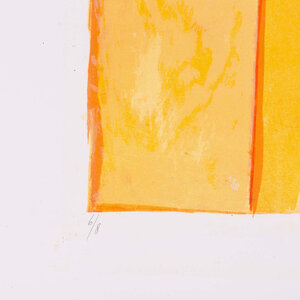 Fenneke van der Elst, Zonder titel, 1990. Litho op papier zonder lijst, oplage 6/8. Kleurrijke, abstracte voorstelling lijkend op huizen met puntdaken in rood, groen en geel. Linksonder oplagenummer, in midden signatuur en rechtsonder jaartal. Conditie: goed, aan de achterkant resten van tape. Afmeting papier: 51 x 70 cm.