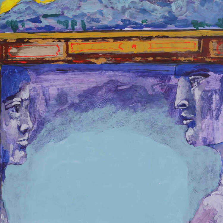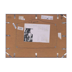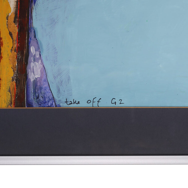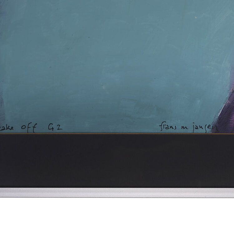 F.M. Jansen, Take off G2, jaartal onbekend. Gemengde techniek op papier in metalen lijst. Kleurrijke compositie van rechts twee gezichten en profil in paars onder een poort en links een bloem. Rechtsonder titel en signatuur. Op de achterzijde een A4 vel geplakt met informatie over de kunstenaar. Conditie: goed, gebruikssporen aan lijst. Afmeting werk zonder lijst: 40 x 60 cm, incl. lijst: 50,5 x 71 cm.