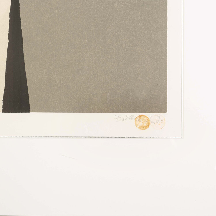 Fon Klement, A L instar, 1984. Hoogdruk op papier in metalen lijst, oplage 75/100. Abstracte voorstelling in grijs, geel, zwart en wit. Linksonder titel en oplagenummer, rechtsonder signatuur en jaar. Conditie: gebruikssporen aan lijst. Afmeting lijst: 78 x 75 cm.