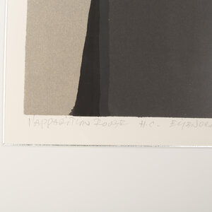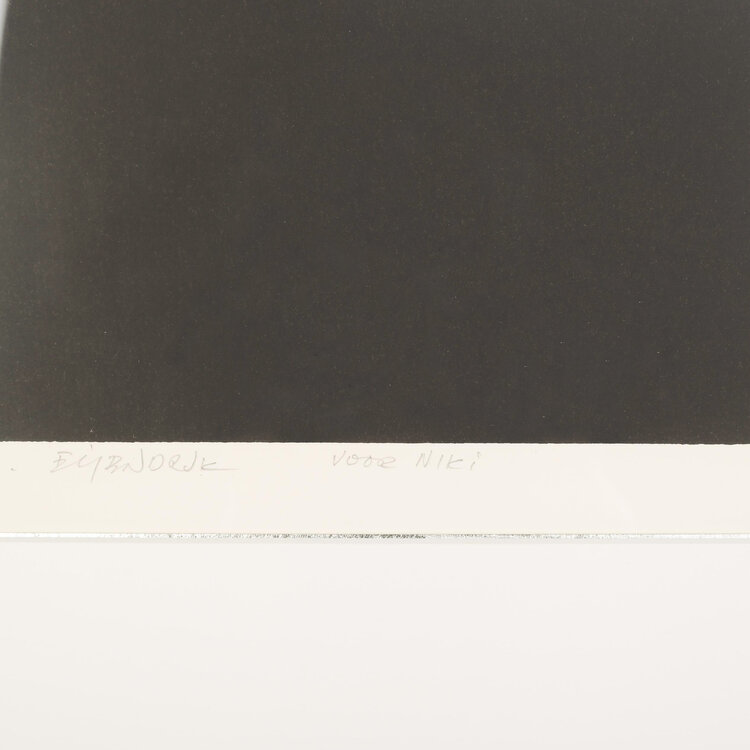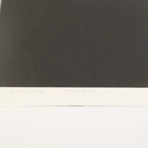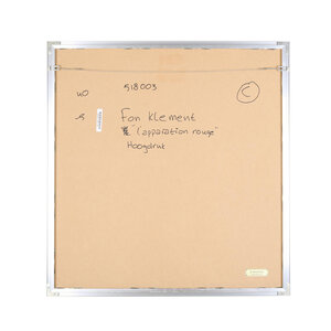 Fon Klement, L'apparition rouge, 1984. Hoogdruk op papier in metalen lijst, oplage H.C. Abstracte voorstelling in grijs, rood, zwart en wit. Linksonder titel en oplagenummer, in midden 'voor Niki' en rechtsonder signatuur en jaar. Conditie: gebruikssporen aan lijst. Afmeting lijst: 78 x 75 cm.