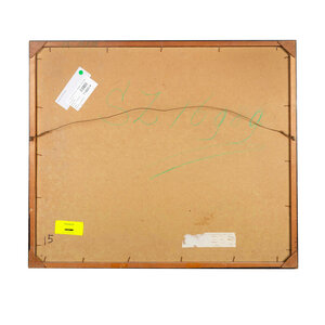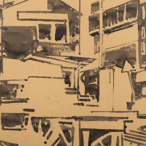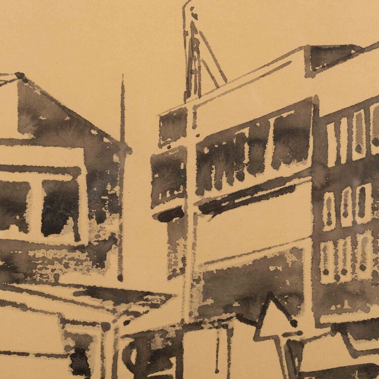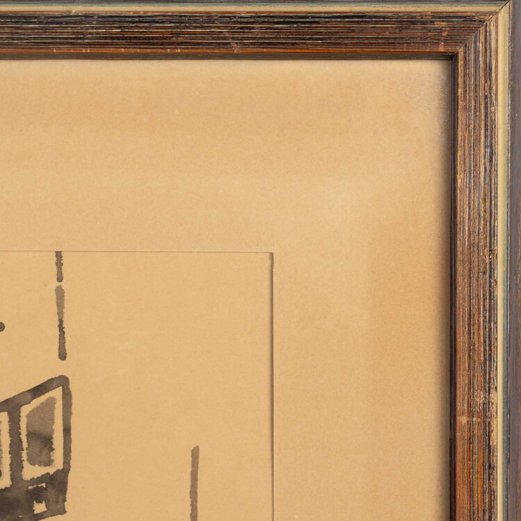 Fr. Wollaars, Zonder titel, 1962. Lithografie op papier in houten lijst. Illustratie van diverse gebouwen. Rechtsonder signatuur en jaar. Conditie: papier en passe-partout zijn verkleurd, lijst toont gebruikssporen. Afmetingen: werk 36 x 48 cm, lijst 52 x 61 cm.
