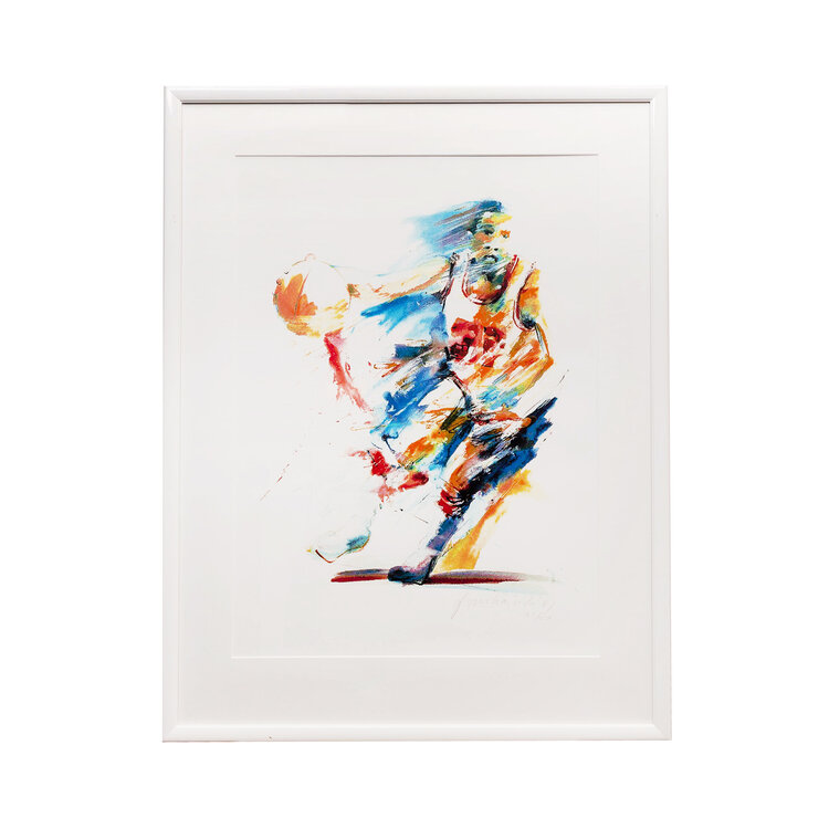 Frank Gude, 'Basketbal', 1987. Zeefdruk op papier in witte lijst, oplage 105/250. Afbeelding van een basketballer in rood, blauw en oranje. Rechtsonder signatuur en jaar. Conditie: Het werk is in goede conditie, de lijst toont lichte gebruikssporen. Afmeting lijst: 93 x 71 cm.