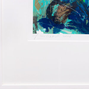 Frank Gude, 'Golfspeler', 2006. Zeefdruk op papier in witte lijst, oplage E/A 20. Kleurrijke en abstracte afbeelding van golfer met club over zijn rechter schouder voor een oranje achtergrond. Linksonder signatuur en jaar. Conditie: Het werk is in goede conditie, de lijst toont lichte gebruikssporen. Afmeting lijst: 83 x 70 cm.