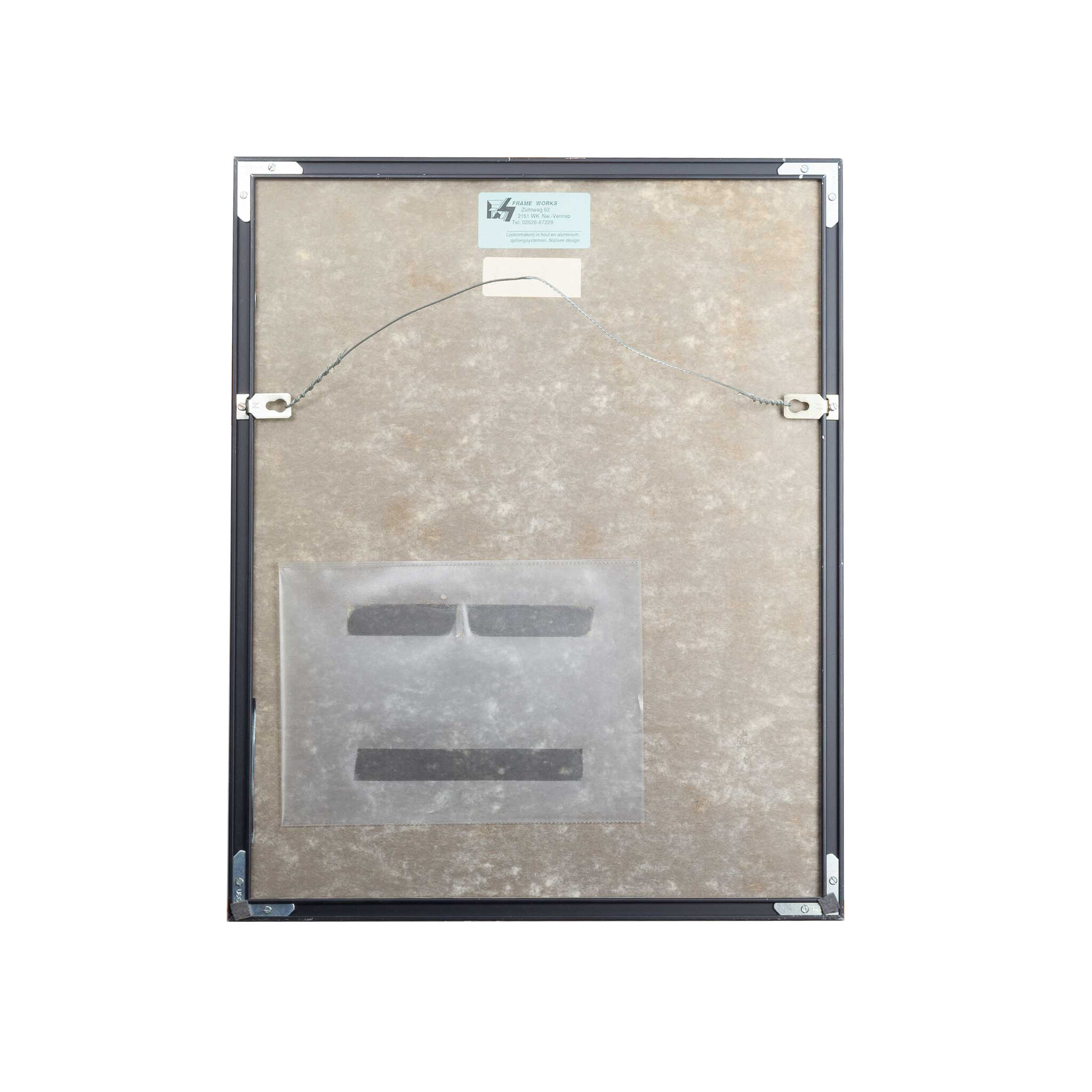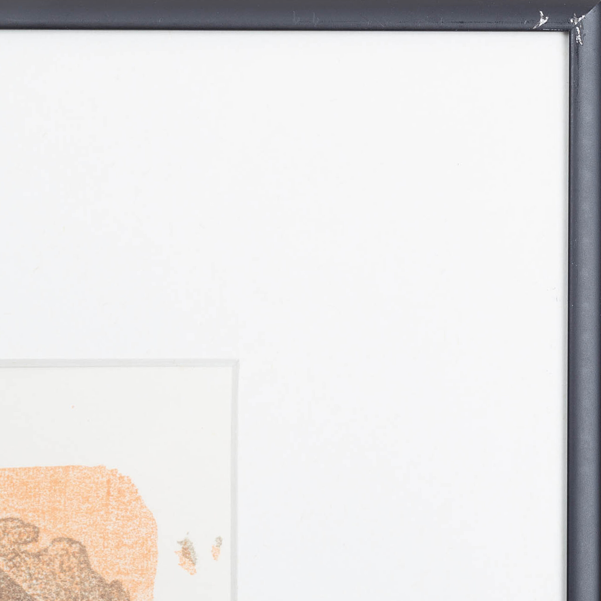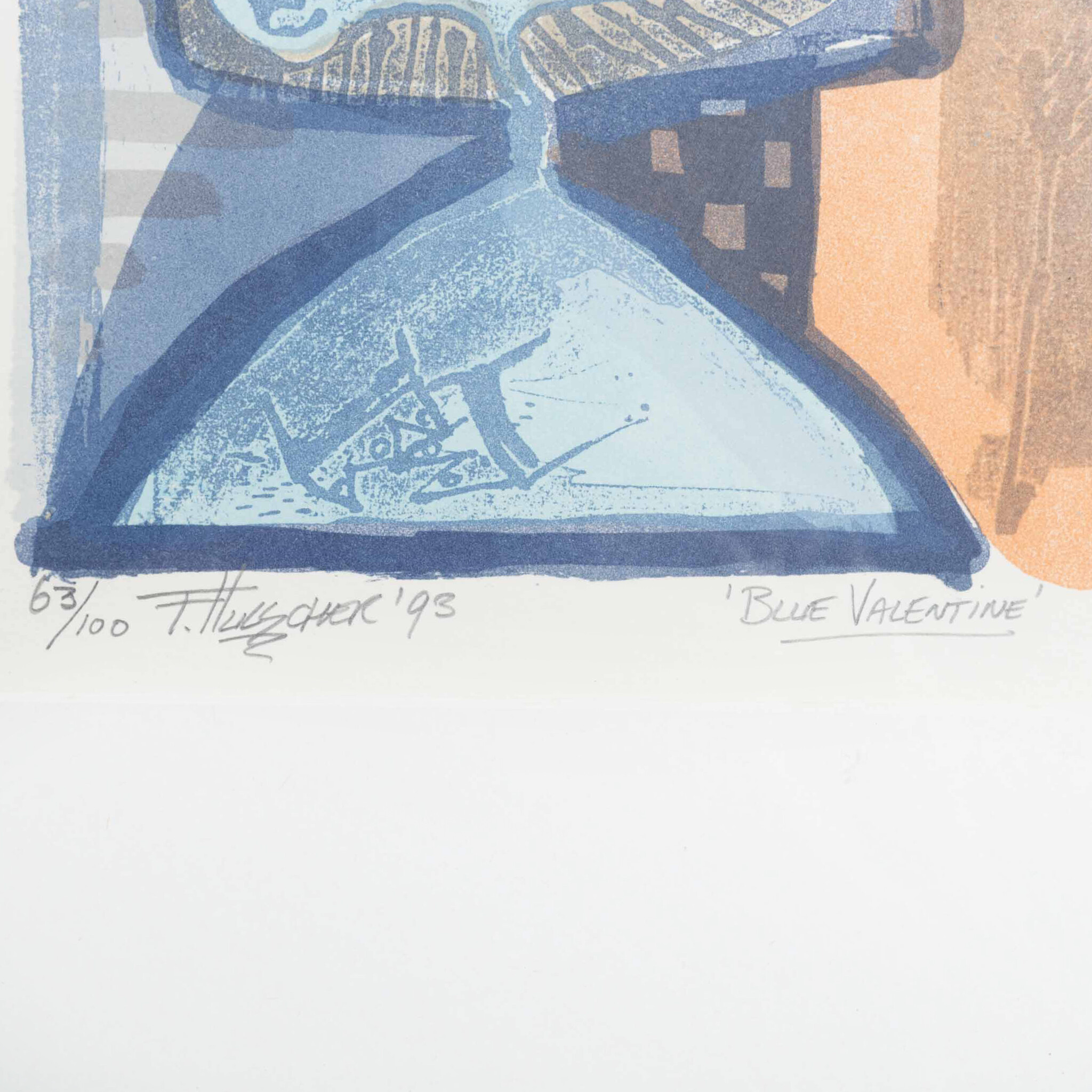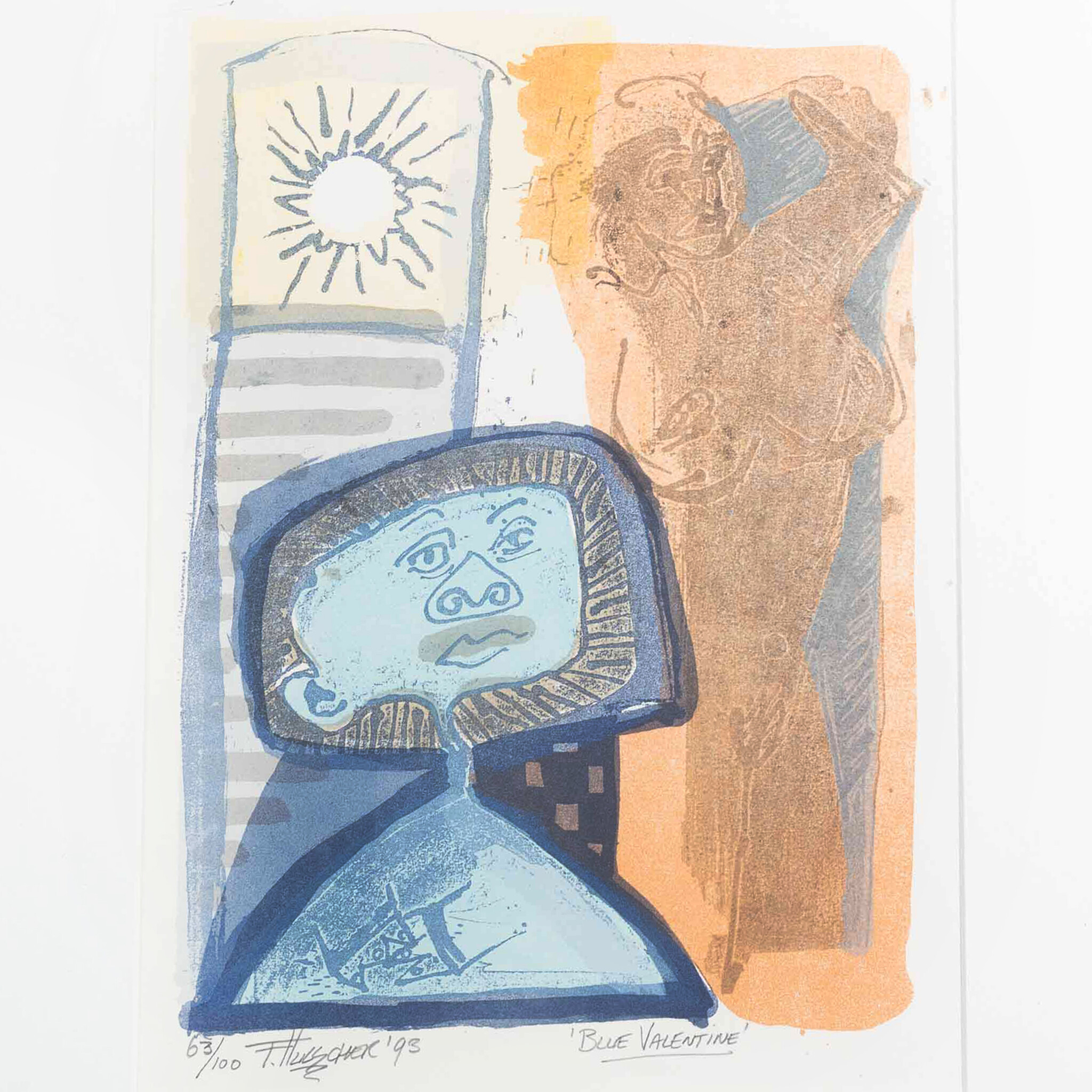 Frank Hulscher (Delft, 1958 - 2009), 'Blue Valentine', 1993. Lithografie op papier in een zwart metalen lijst, oplage 63/100. Afbeelding van een blauw figuur en een naakte vrouw in een oranje vlak. Signatuur linksonder. Conditie: beschadigingen aan lijst. Afmetingen: beeldvlak 29 x 21 cm; lijst 45 x 36,5 cm.
