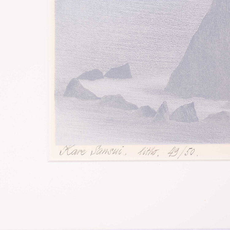 Fred Koot, Kare Sansui, jaartal onbekend. Litho in passe-partout zonder lijst, oplage 49/50. Afbeelding van stenen/rotsen in een Japanse rotstuin in grijstinten. Rechtsonder signatuur. Conditie: goed. Afmeting passe-partout: 65 x 50 cm.