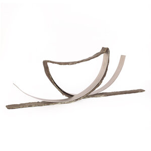 Fredy Wolf, Zonder titel, jaartal onbekend. Stalen sculptuur van gebogen plaatmateriaal en staalplastiek. Conditie: gebruikssporen zoals krassen en roest. Afmeting: H25 x B70 x D10,5 cm.
