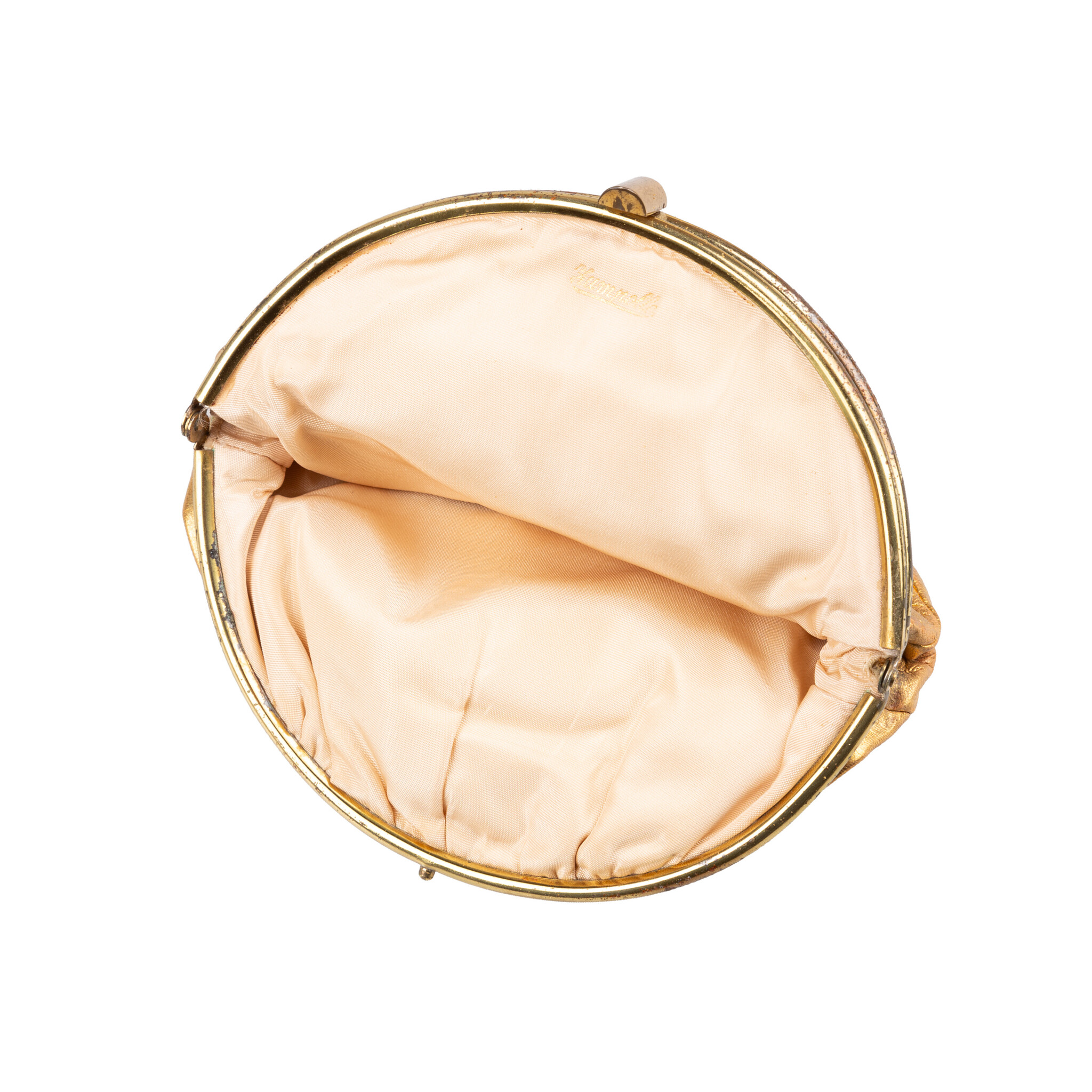 Gala setje met avondtas, portemonnee en gala handschoenen, 20ste eeuw. De goudkleurige avondtas heeft een crèmekleurige binnenvoering met opbergvakje. Aan de decoratieve beugel zit een draagketting; De goudkleurige portemonnee heeft twee compartimenten met crèmekleurige binnenvoering, en is van het merk Zumpolle; Een paar gala handschoenen in zalmroze. Conditie: sporen van gebruik en ouderdom. Afmetingen avondtas: 15 x 20 x 3 cm; hoogte met hengsel 28 cm. Afmetingen portemonnee: 10 x 13 x 1,5 cm. Afmetingen handschoenen: ca. 48,5 x 8 cm.