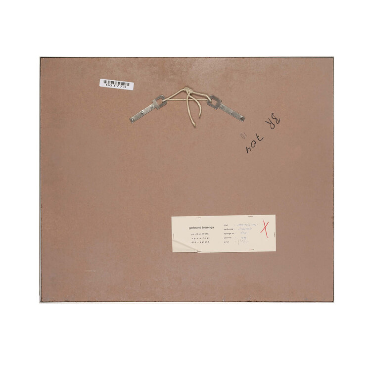 Gebrand Bieringa, Nachtelijk spel, 1974. Litho in metalen lijst, oplage 18/35. Afbeelding van een naakte vrou met vogelmasker en een naakte man met paardenmasker die grote opstaande schelpen vasthouden. Linksonder titel en oplagenummer, rechtsonder signatuur en jaar. Conditie: goed, gebruikssporen aan lijst. Afmeting lijst: 51 x 61 cm.