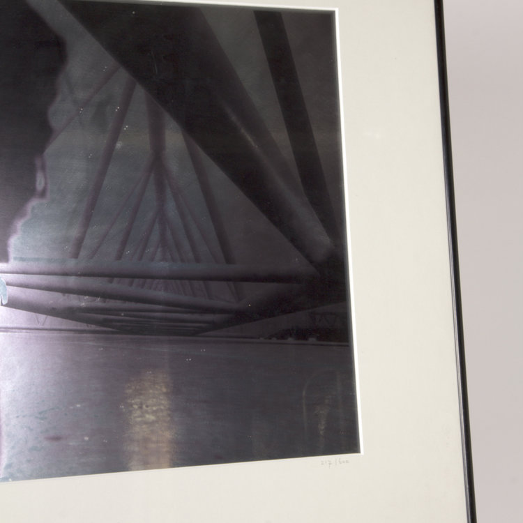 Geek Zwetsloot, Zonder Titel, fotografie en spiegel. Het werk toont een figuur bij een brug. Linksonder werd het gesigneerd en rechtsonder is op het passe-partout het oplagenummer 217/600 aangebracht. Geek Zwetsloot is een Nederlandse fotograaf. Hij volgde zijn opleiding aan de Fotovakschool in Apeldoorn. Datering: eind 20ste eeuw. Conditie: het werk is in goede staat, maar het is aan te raden om het werk opnieuw in te lijsten. De lijt heeft namelijk schade opgelopen en het glas is onderaan in de rechterhoek gebroken. Afmetingen: ca. 61,0 x 40,0 cm.