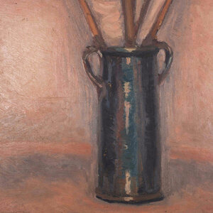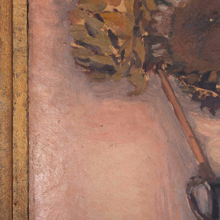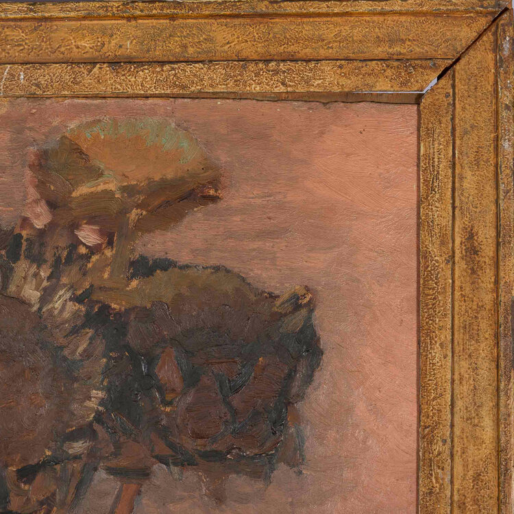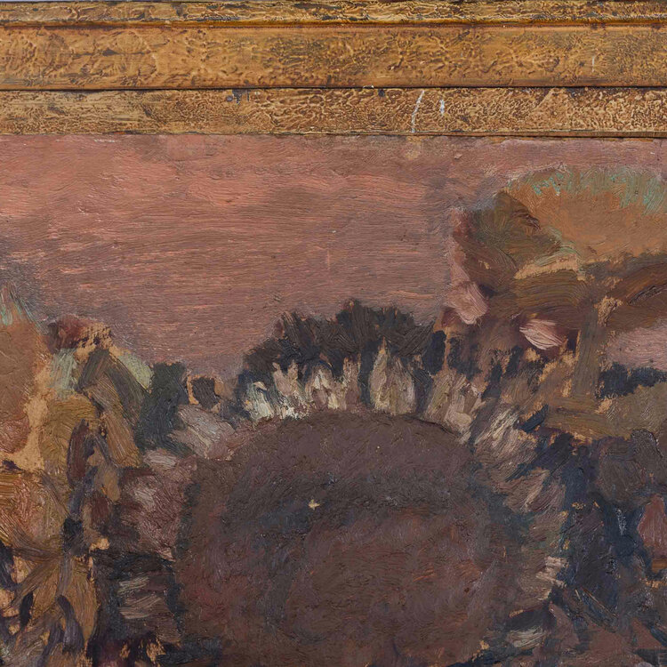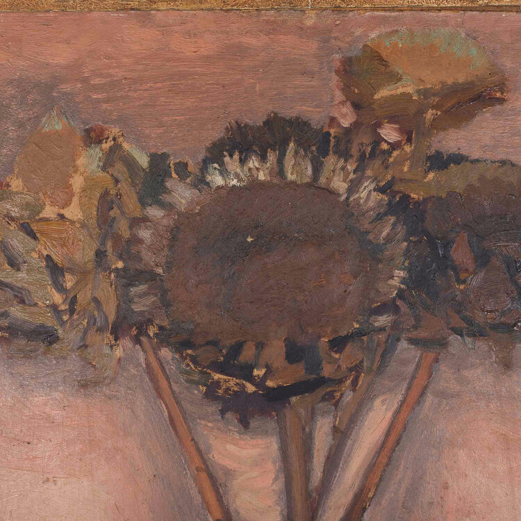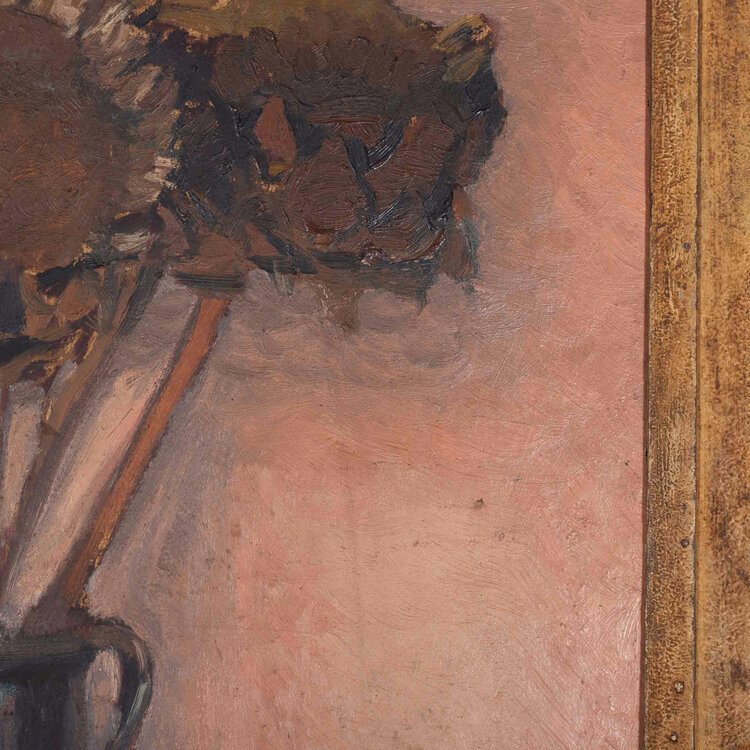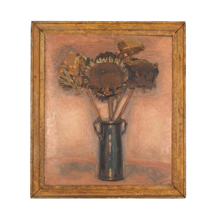 Gerard Sluijter (1901-1985), 'Uitgebloeide artisjokken', 1938. Olieverf op doek in houten lijst. Afbeelding van bloemen in een groene vaas in terra en bruintinten. Signatuur rechtsonder. Het Stedelijk Museum Amsterdam heeft ook een werk van deze kunstenaar in de collectie. Conditie: verf in bloem iets beschadigd, beschadigingen lijst. Afmetingen incl lijst: ca 76 x 65 cm.
