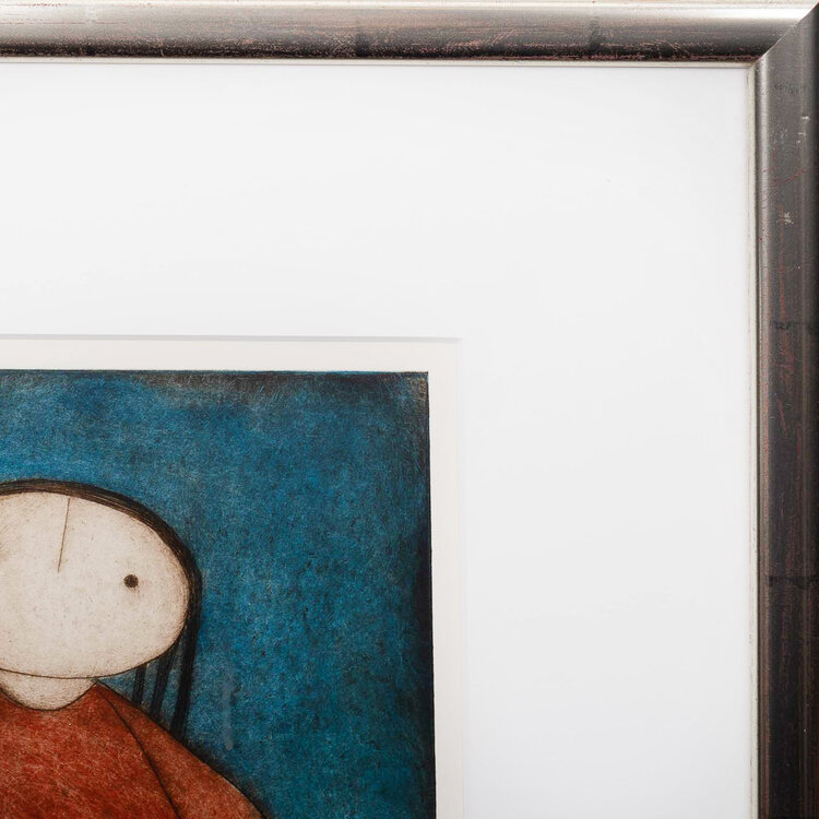 Gerda Smit, 'Zonder Titel', 2000. Ets in zilverkleurige lijst met passe-partout, oplage 22/35. Afbeelding van twee meisjes met rode jurken voor een blauwe achtergrond. De etsen van Gerda Smit zijn herkenbaar. Na gewerkt te hebben in het kleuteronderwijs, volgde ze een opleiding voor graficus aan de kunstacademie. Linksonder oplagenummer, rechtsonder signatuur en jaar. Conditie: goed, de lijst toont lichte gebruikssporen. Afmeting lijst: 59 x 56 cm.