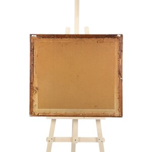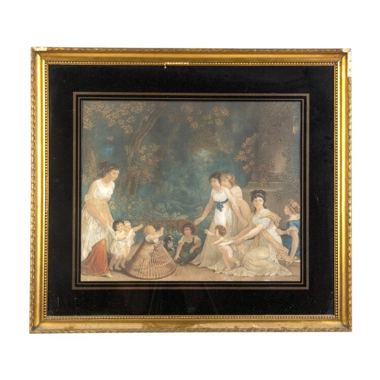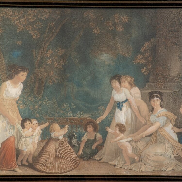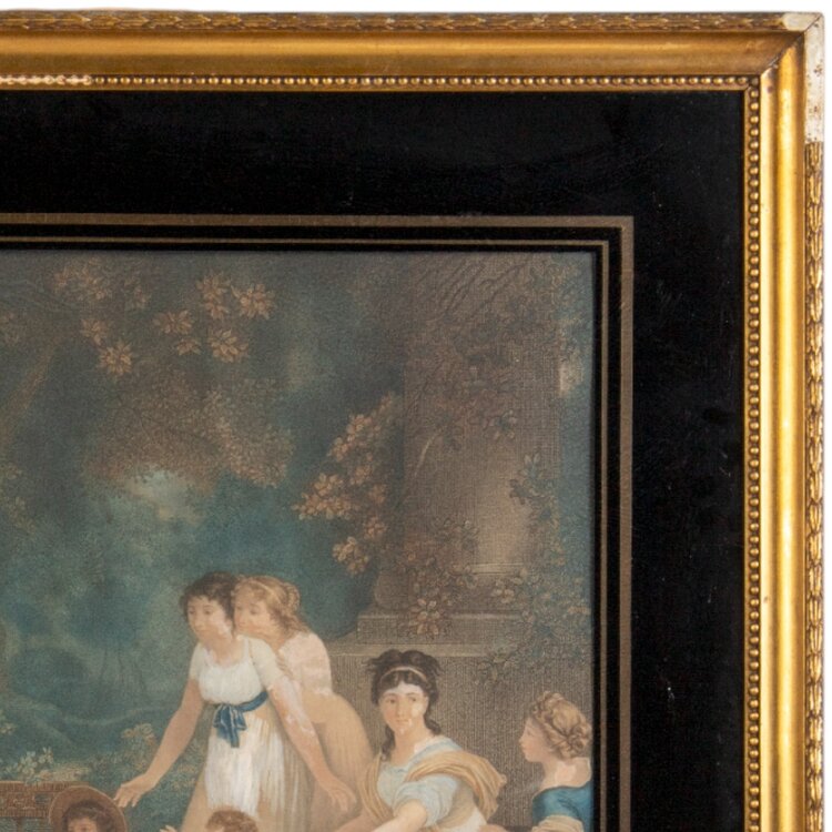 Gezelschap met vrouwen en kinderen in Empire kleding door onbekende kunstenaar. Ingekleurde kopergravure met een idyllische voorstelling van vrouwen en kinderen, omgeven door klassieke architectuur en een boslandschap. Het werk is ingezet in een zwarte passe-partout met gouden rand en ingelijst in een houten lijst met composiet sierranden. Datering: begin 19e eeuw. Conditie: de verflaag op de figuren is op meerdere plaatsen aangetast. De lijst mist op drie plaatsen stukken van de sierranden. Afmetingen ca: 50 x 60 cm.