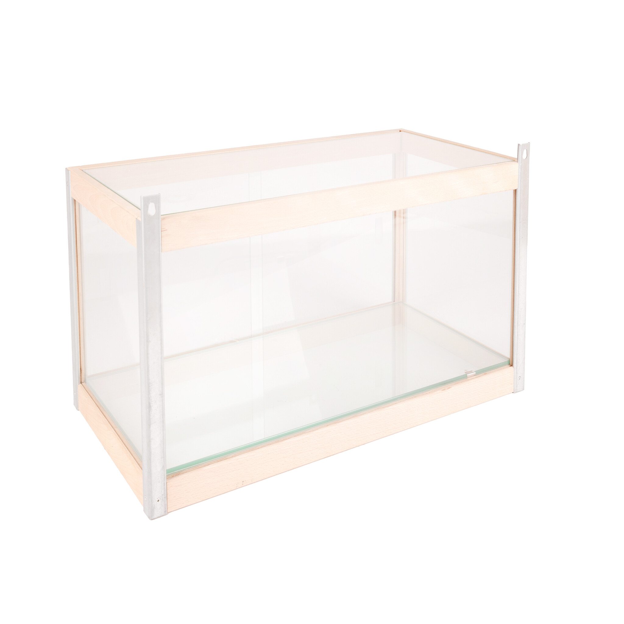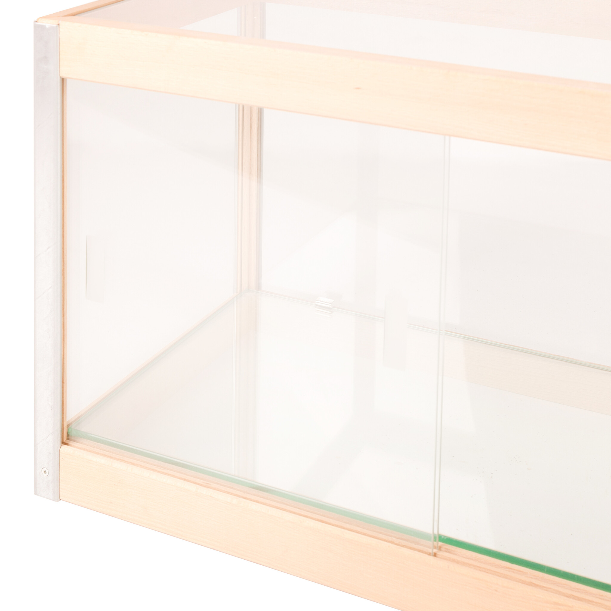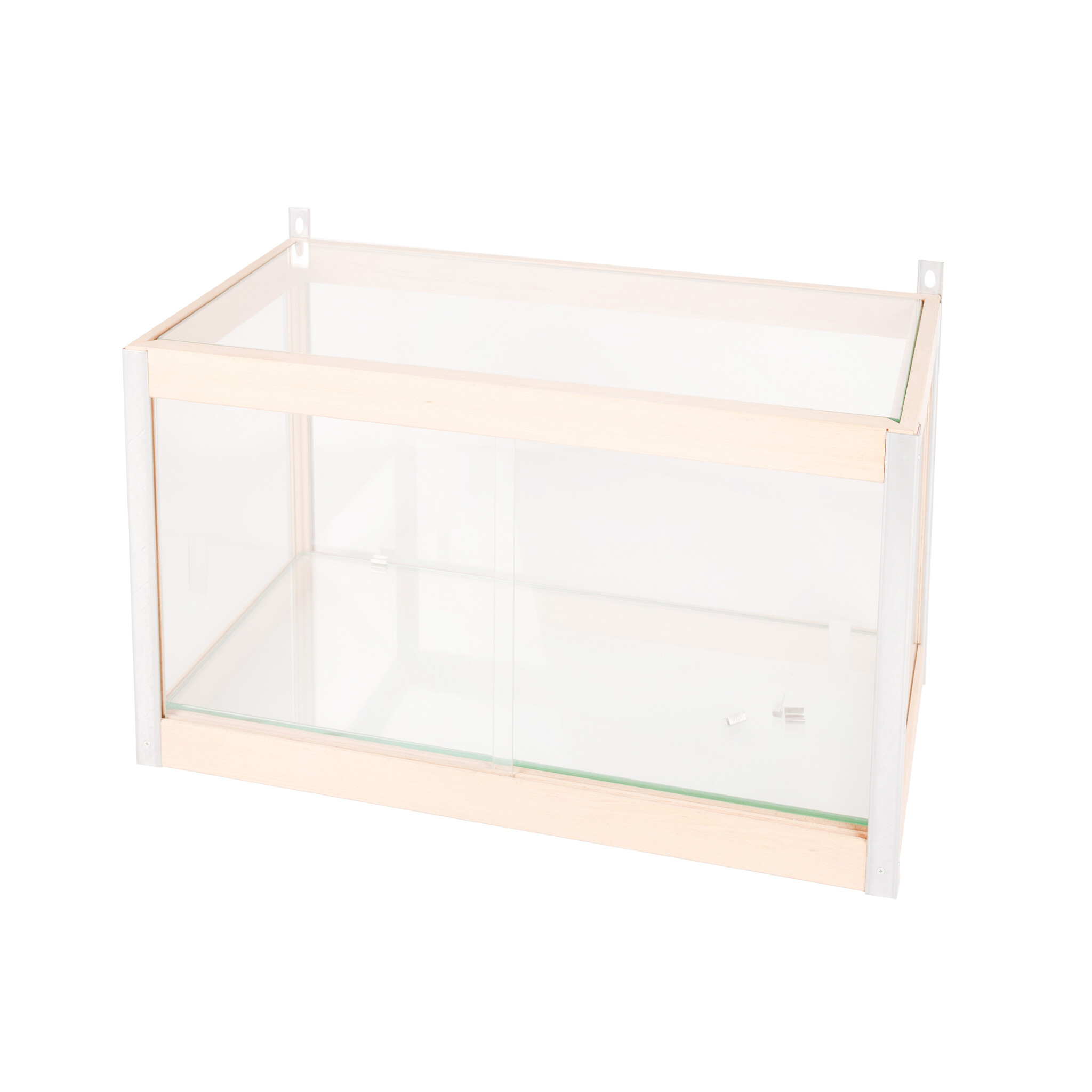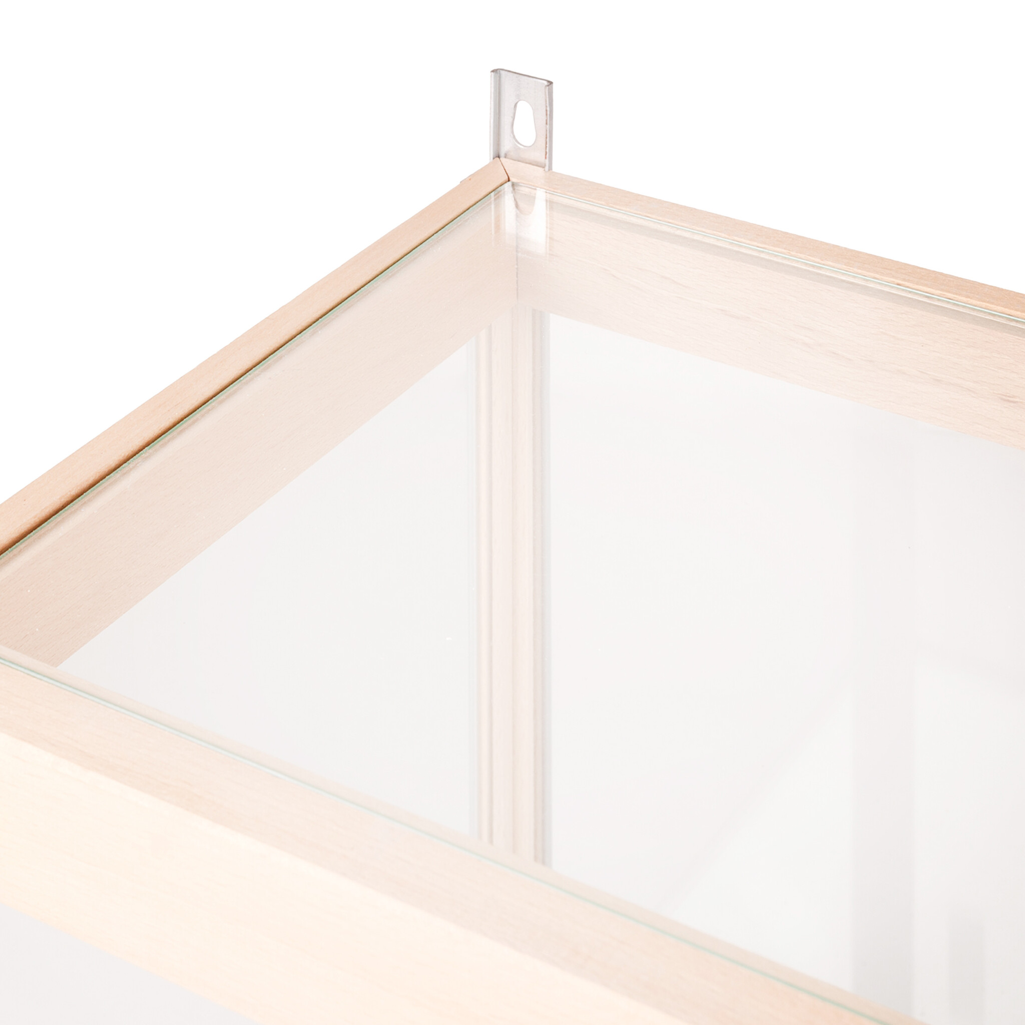 Glazen wandvitrine met houten frame met aan alle zijden glas. Aan de voorkant zitten glazen schuifdeurtjes. Op de staanders van het houten frame zijn metalen profielen bevestigd, waarvan twee met ophangsysteem. De vitrine is gebruikt door het Nederlands Fotomuseum in Rotterdam voor exposities. Datering: 21ste eeuw. Conditie: gebruikssporen. Afmetingen: ca. 35 x 61,5 x 31,5 cm.