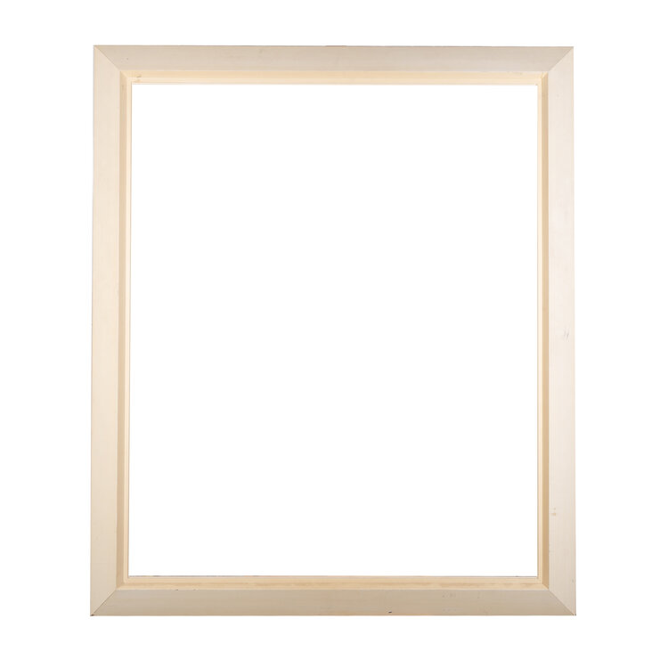 Grote schilderijlijst, 20ste eeuw. De crèmewitte houten schilderijlijst heeft een verloop in dikte van 1cm aan de buitenkant naar 4 cm aan de binnenkant. Conditie:de lijst vertoont gebruikssporen, zoals krasjes, vlekken en is verkleurd. Afmetingen: buitenmaat ca. 138 cm x 117,5 x 1 cm; binnenmaat ca. 118,5 x 98 x 4 cm.