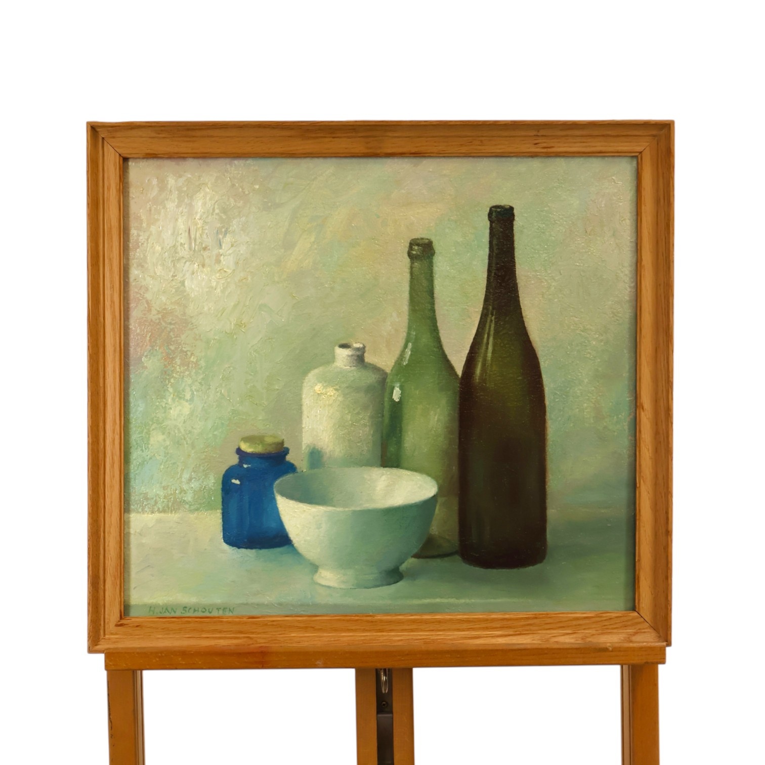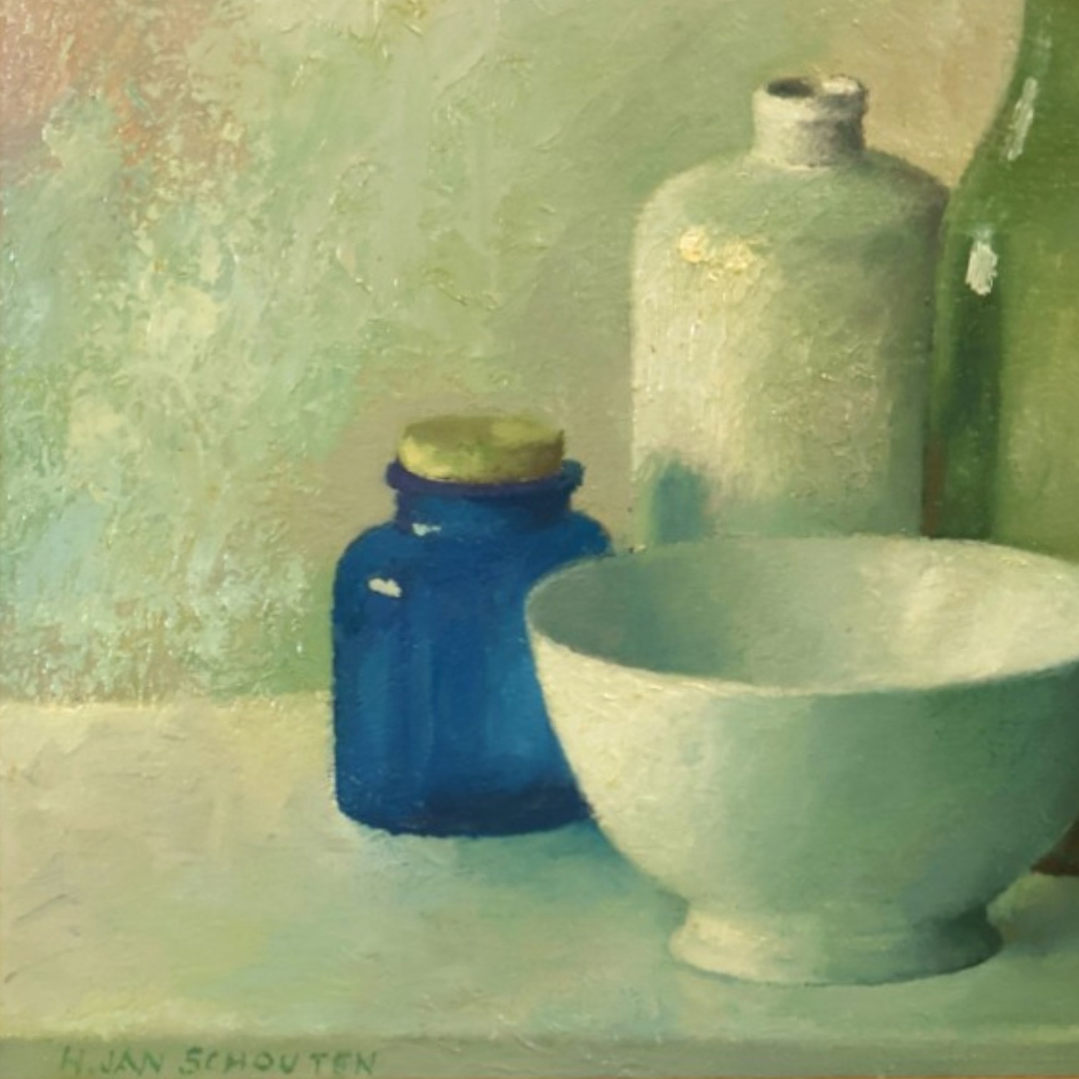H. Jan Schouten, 'In beraad', 1985. Olieverf op doek. Stilleven van vier flessen en een kom. Titel op de achterkant van het doek. Signatuur linksonder. Jan Schouten (Rotterdam 1906 - Gouda 1987) volgde na een kort bestaan als priester en als godsdienstleraar in Eindhoven de Academie voor Beeldende Kunst te Tilburg. Daarna vestigde hij zich als kunstenaar in Gouda en werd later directeur van de stedelijke Musea Gouda. Conditie: vertoont gebruikssporen. Afmetingen: beeldvlak 39,5 x 44,5 cm, met lijst: 44,5 x 46,7 x 2,5 cm.