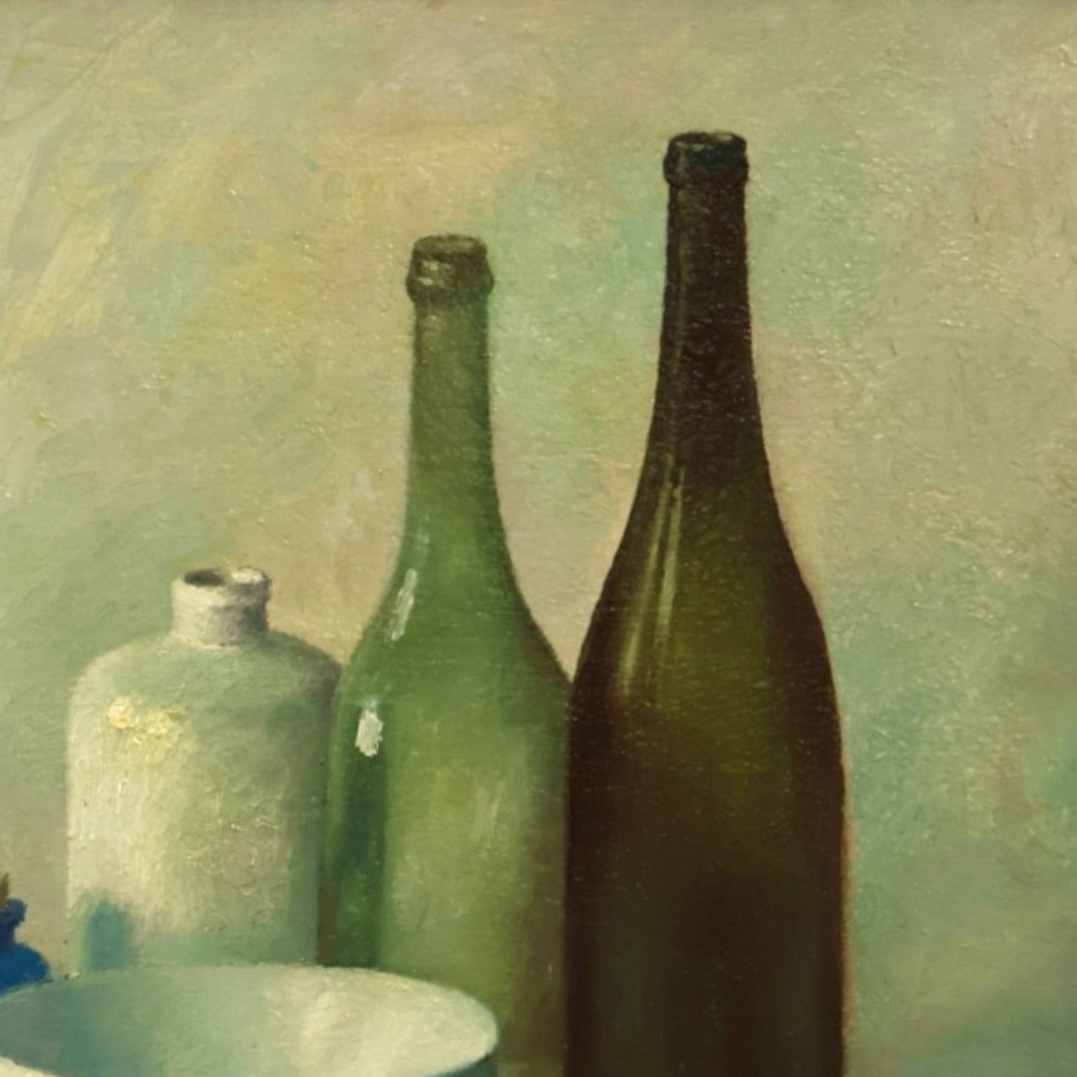 H. Jan Schouten, 'In beraad', 1985. Olieverf op doek. Stilleven van vier flessen en een kom. Titel op de achterkant van het doek. Signatuur linksonder.