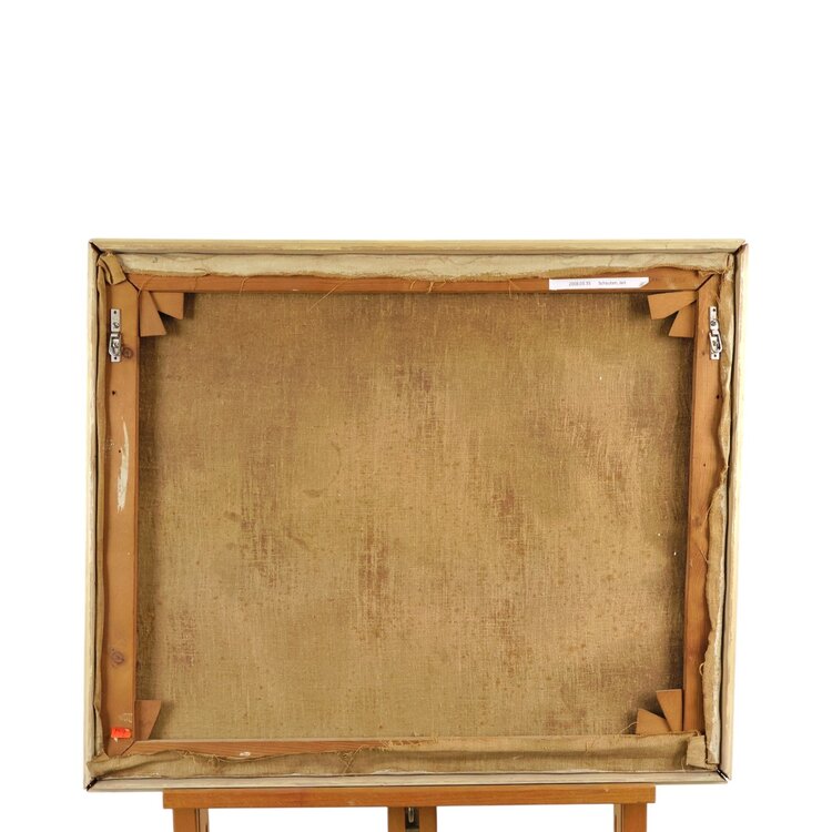 H. Jan Schouten, 'Stilleven met schelp en roemer'. Datering onbekend. Olieverf op doek in houten lijst. Stilleven van een schelp en roemer (wijnglas) op blauw en oranje doek. Signatuur rechtsonder. Jan Schouten (Rotterdam 1906 - Gouda 1987) volgde na een kort bestaan als priester en als godsdienstleraar in Eindhoven de Academie voor Beeldende Kunst te Tilburg. Daarna vestigde hij zich als kunstenaar in Gouda en werd later directeur van de stedelijke Musea Gouda. Conditie: goed, alle vier de hoeken van de lijst zijn los van het canvas. Afmetingen: beeldvlak 49,5 x 60 cm, met lijst 52,5 x 62,5 x 3 cm.