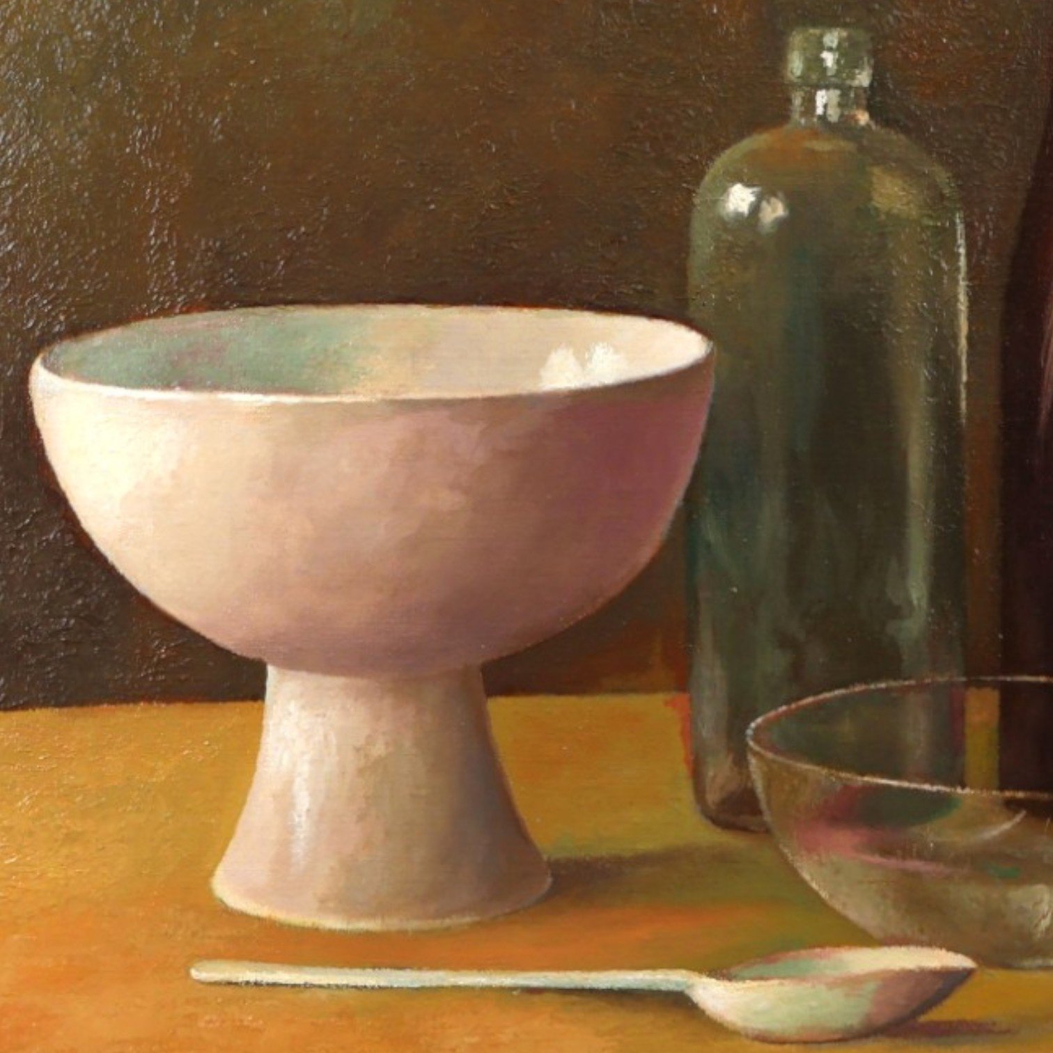 H. Jan Schouten, 'Stilleven', 1986. Olieverf op doek. Stilleven van twee flessen, twee kommen en een lepel. Titel op de achterkant van het doek. Signatuur rechtsonder. Jan Schouten (Rotterdam 1906 - Gouda 1987) volgde na een kort bestaan als priester en als godsdienstleraar in Eindhoven de Academie voor Beeldende Kunst te Tilburg. Daarna vestigde hij zich als kunstenaar in Gouda en werd later directeur van de stedelijke Musea Gouda. Conditie: goed. Afmetingen: beeldvlak 50 x 54 cm, met lijst 51,3 x 56,5 x 3 cm.