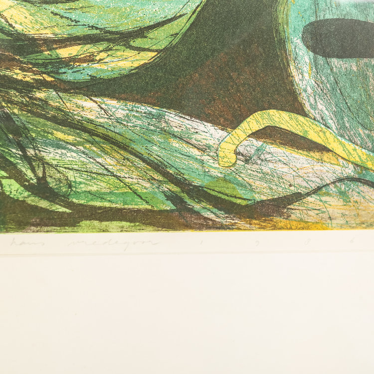 Hans Vredegoor, Cressendo II, 1986. Ets in metalen lijst, oplage 17/35. Abstracte voorstelling van wilde lijnen op een achtergrond in groen-tinten. Linksonder titel en oplagenummer, rechtsonder signatuur en jaar. Conditie: goed, gebruikssporen aan lijst. Afmeting werk: 49 x 59 cm, lijst: 90 x 70 cm.