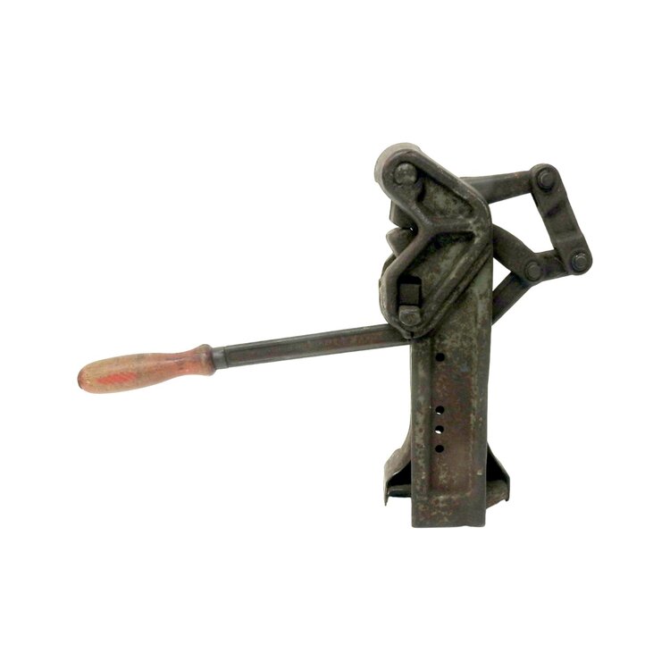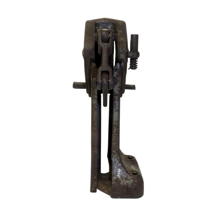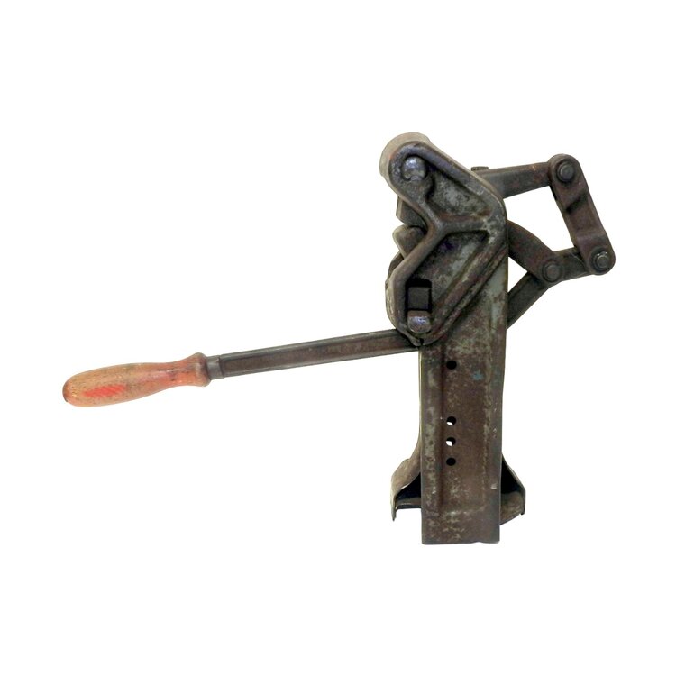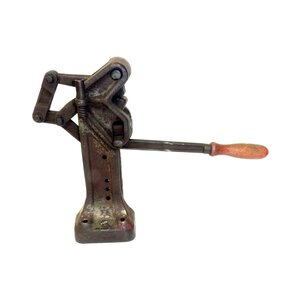 Haarapparaat, datering eerste helft 20ste eeuw. Metalen apparaat met houten handvat voor het haren (scherp maken) van gereedschappen, zoals zeisen, zichten en sikkels. Conditie: enige roestvorming. Afmeting: H. 33 cm, Br. 43 cm, D. 13 cm.