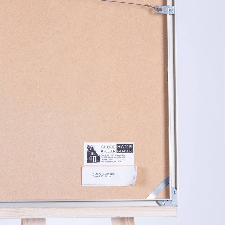 Gedetailleerde aquarel met op de voorgrond een ui waar sprieten uit groeien tegen een achtergrond van een ruïne met begroeiing. De titel van het werk, 'Memento', verwijst vermoedelijk naar de uitspraak 'memento mori', wat 'gedenk te sterven' betekent. De ui waar nieuw leven uit groeit en het vervallen bouwwerk kunnen binnen dat thema gezien worden als symbolen voor leven en dood. Het werk is ingelijst achter glas met passe-partout. Kunstenaar Haije Gemser (Leeuwarden, 1940) maakt aquarellen, schilderijen en etsen. Dieren, met in het bijzonder vogels, zijn een veelvoorkomend onderwerp in zijn werk. In Velsen-Zuid heeft Gemser zijn eigen atelier en galerie. Datering: 2000. Conditie: het werk is in goede conditie. De lijst heeft een stukje gebroken glas rechtsonder. De lijst heeft gebruikssporen. Afmetingen: lijst ca. 50.5 x 50.5 cm, werk ca. 32 x 32 cm.