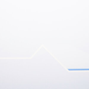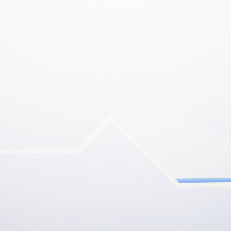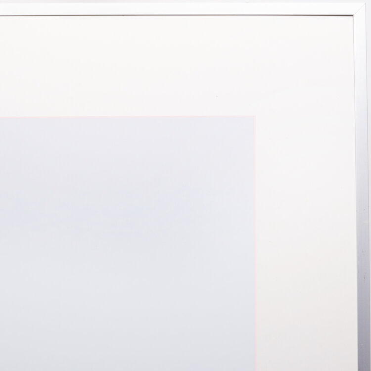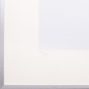Han Jansen (Kloosterburen, 1931 - Loosdrecht, 1994), 'Zonder titel', jaartal onbekend. Zeefdruk in metalen lijst, oplage 12/20. Abstracte compositie in blauw, rondom een roze kader. Signatuur rechtsonder. Conditie: werk is in goede conditie, lijst toont gebruikssporen en glas mist. Afmetingen lijst: 70 x 70 cm; beeldvlak: 50 x 50 cm.