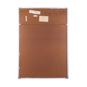Hans Vredegoor, Tour de passe-passe 1, 1992. Ets in metalen lijst, oplage 44/45. Abstracte voorstelling van zwarte lijnen en kleurrijke accenten voor een blauwe achtergrond. Titel en oplagenummer linksonder, signatuur en jaartal rechtsonder. Conditie: goed, gebruikssporen aan lijst. Afmeting werk zonder lijst: 76 x 46 cm.