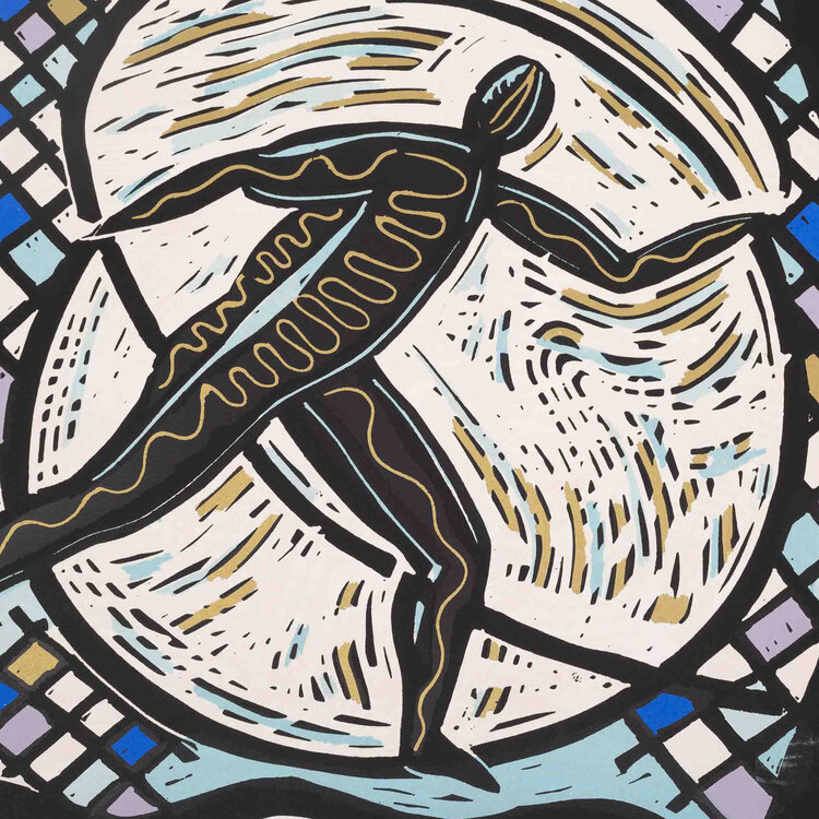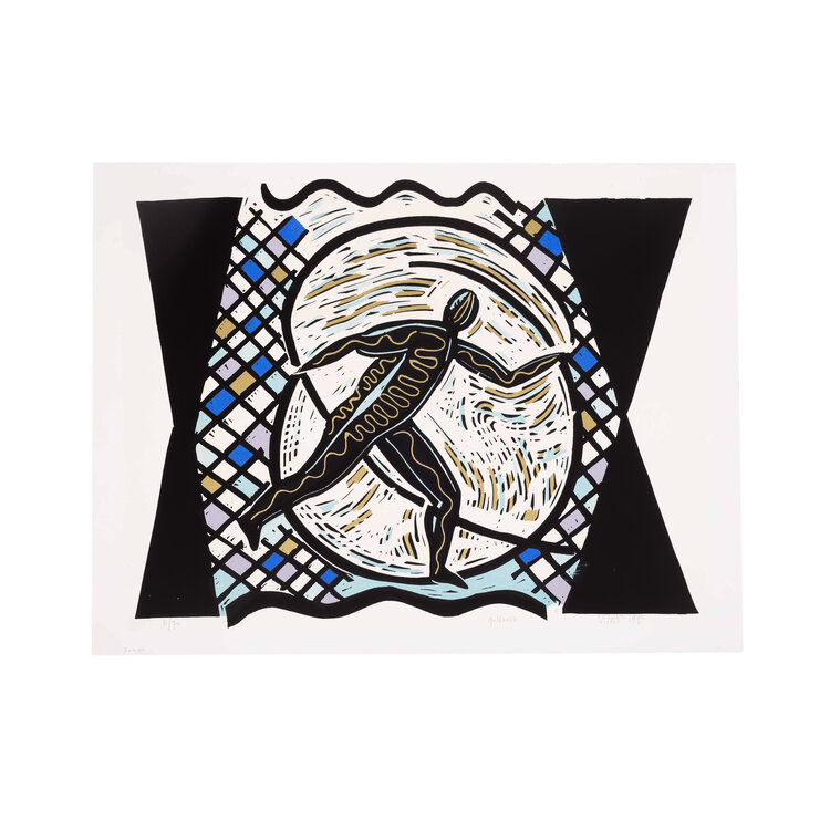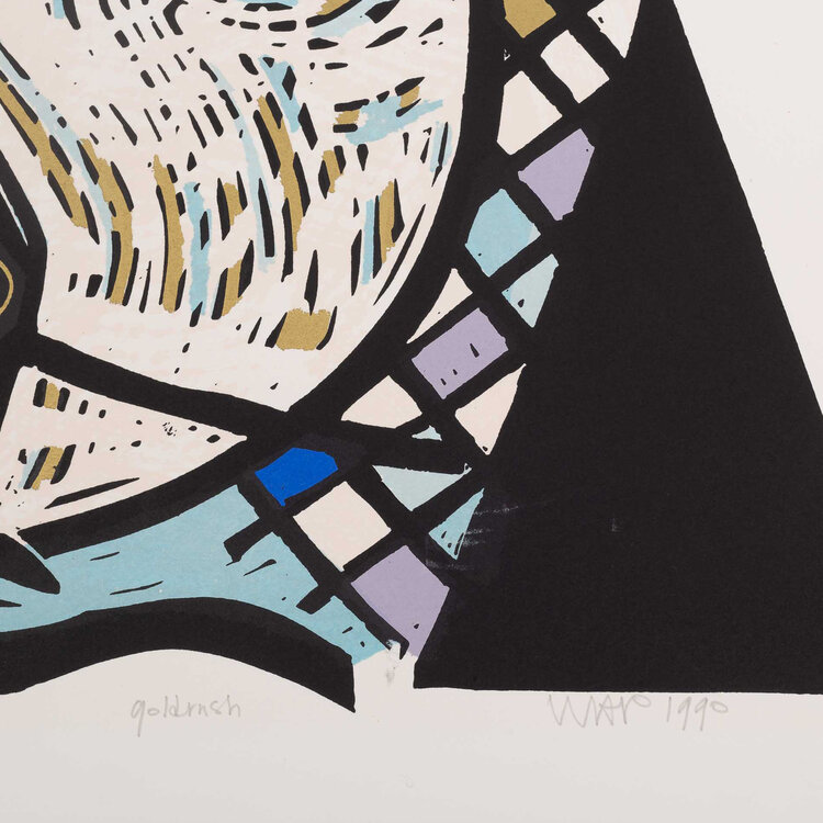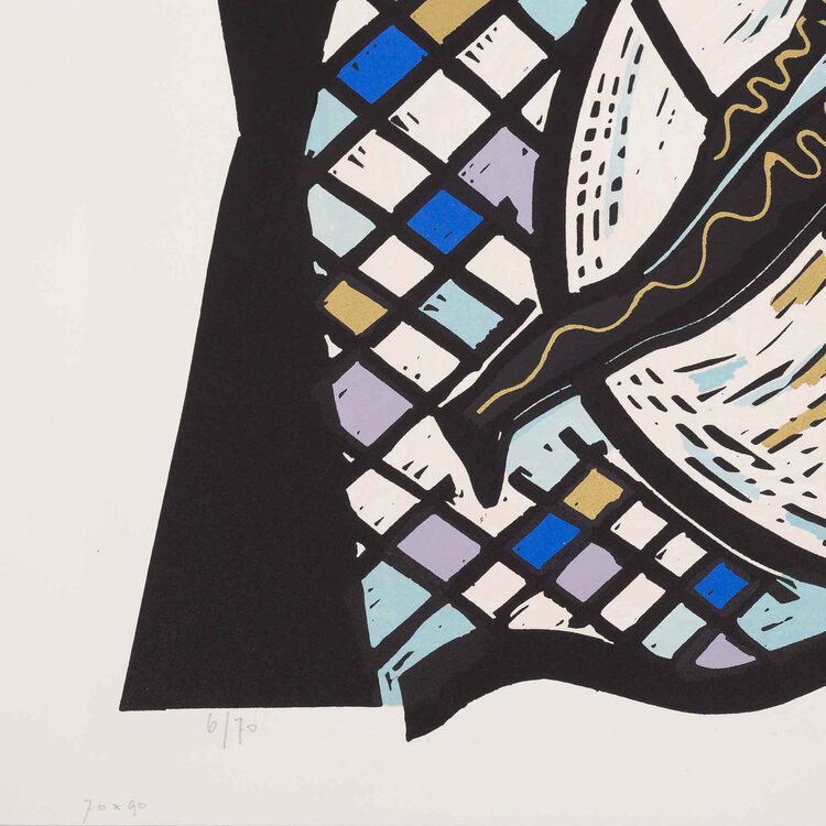 Hans Wap, Goldrush, 1990. Zeefdruk op papier zonder lijst, oplage 6/70. Afbeelding van een figuur met daaromheen zwarte en gouden lijnen en een raster in de kleuren zwart, blauw en paars. Signatuur rechtsonder. Conditie: het papier toont hier en daar gebruikssporen, aan de achterkant resten van tape. Afmeting papier: 56 x 75 cm.