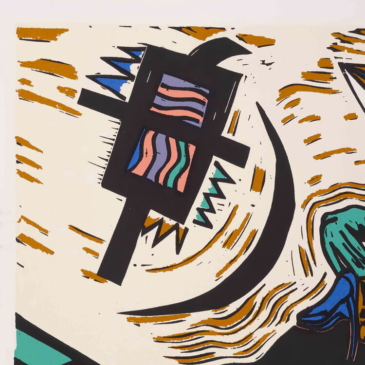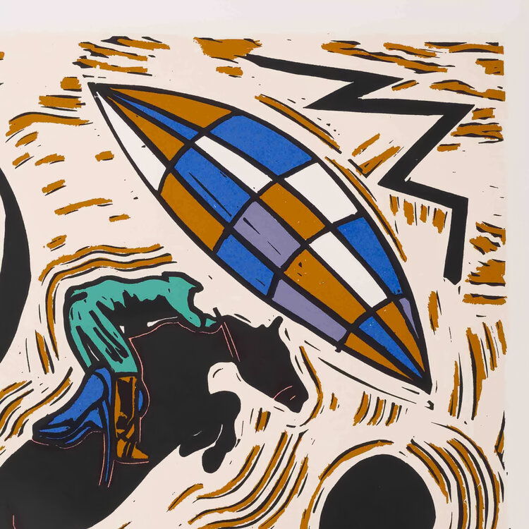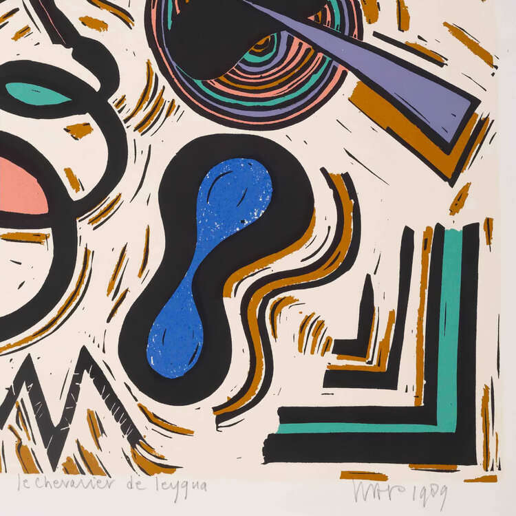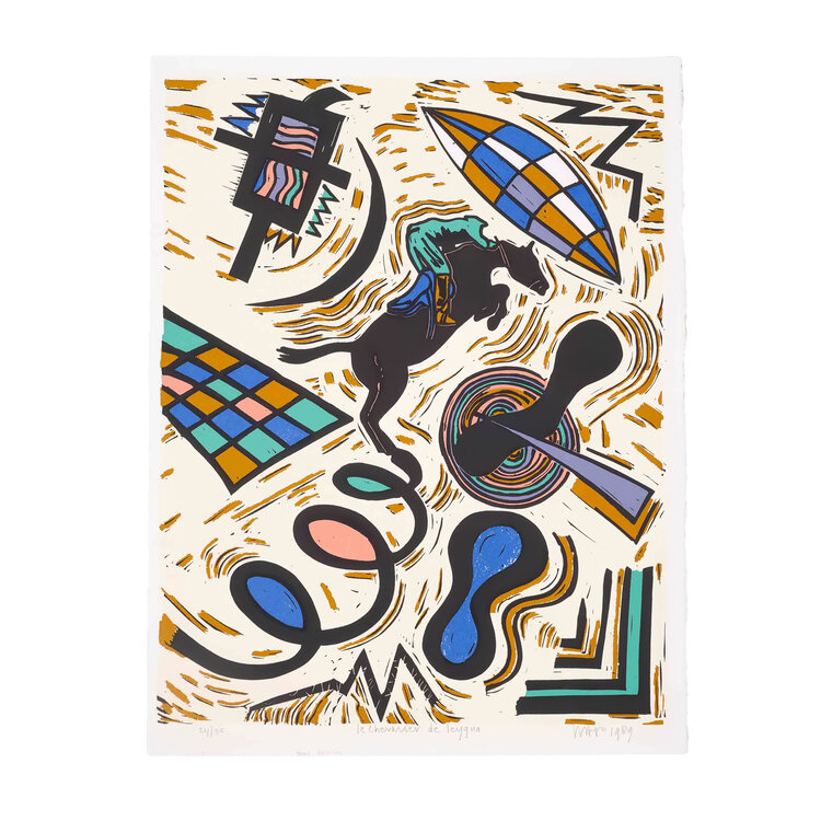 Hans Wap, Le chevalier de Leygua, 1989. Zeefdruk op papier zonder lijst, oplage 24/35. Afbeelding van een man op een springend paard met daaromheen zwarte lijnen en kleurvlakken met blauw, bruin en groen. Signatuur rechtsonder. Conditie: prima. Afmeting papier: 76 x 56 cm.