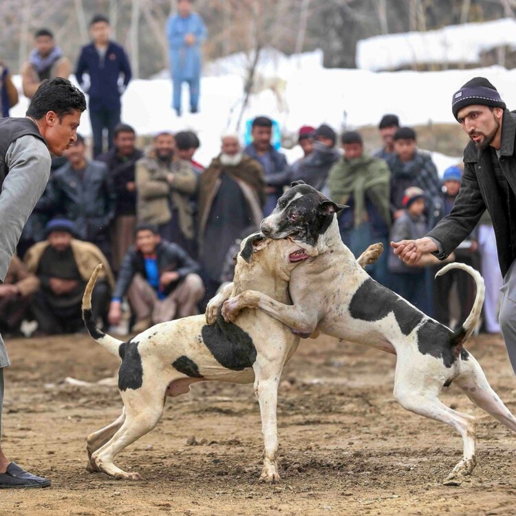 Hedayat Amid, 'Dogfight', 17-2-2017. C-print achter acrylaat. "In de jaren negentig werd hondengevechten onder de Taliban afgeschaft, maar na hun val in 2001 werd het een belangrijke bron van vermaak voor honderden Afghanen. De inzetten kunnen oplopen tot duizenden dollars en de honden, die ouder dan een jaar moeten zijn, worden zeer gewaardeerd. Ze worden gevoed met melk, boter en vlees." Deze foto is geëxposeerd bij de fototentoonstelling ‘Hope & Fear’ in Museum Vlaardingen in 2023. De foto's zijn van de Vlaardingse NRC-fotograaf / Afghaanse oorlogsfotograaf Hedayat Amid. Ze tonen het dagelijkse leven in Afghanistan voor de machtsovername door de Taliban in 2021. Het zijn indrukwekkende foto's van zijn laatste jaar in Afghanistan, voor hij moest vluchten voor de Taliban en in Vlaardingen terecht kwam. Hedayat Amid is genomineerd voor de categorie Documentair Nationaal van de Zilveren Camera 2024. De foto's zijn hoogwaardig afgedrukt op Polielettronica fotoafdruk, op Fujifilm DPII glossy fotopapier, verlijmd achter 3mm helder acrylaat, op 3mm Dibond, met aluminium. Conditie: goed. Afmetingen: 80 x 120 cm.