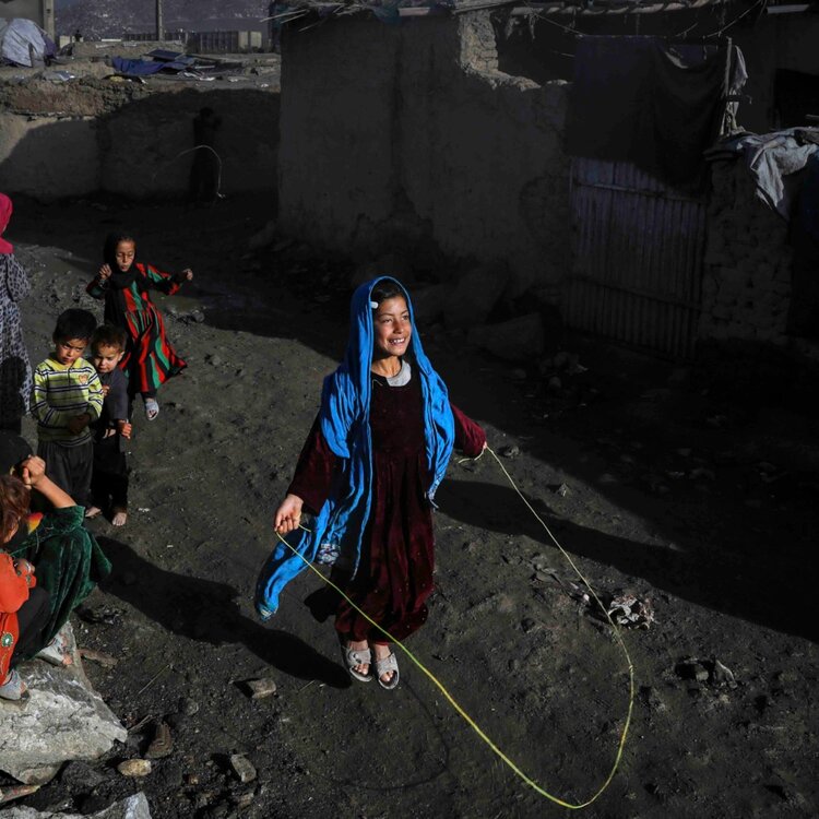 Hedayat Amid, 'Girl skipping rope', 29-4-2020. C-print achter acrylaat. "Een ontheemd meisje speelt met een springtouw buiten haar tijdelijke onderkomen in Kabul." Deze foto is geëxposeerd bij de fototentoonstelling ‘Hope & Fear’ in Museum Vlaardingen in 2023. De foto's zijn van de Vlaardingse NRC-fotograaf / Afghaanse oorlogsfotograaf Hedayat Amid. Ze tonen het dagelijkse leven in Afghanistan voor de machtsovername door de Taliban in 2021. Het zijn indrukwekkende foto's van zijn laatste jaar in Afghanistan, voor hij moest vluchten voor de Taliban en in Vlaardingen terecht kwam. Hedayat Amid is genomineerd voor de categorie Documentair Nationaal van de Zilveren Camera 2024. De foto's zijn hoogwaardig afgedrukt op Polielettronica fotoafdruk, op Fujifilm DPII glossy fotopapier, verlijmd achter 3mm helder acrylaat, op 3mm Dibond, met aluminium. Conditie: goed. Afmetingen: 80 x 120 cm.