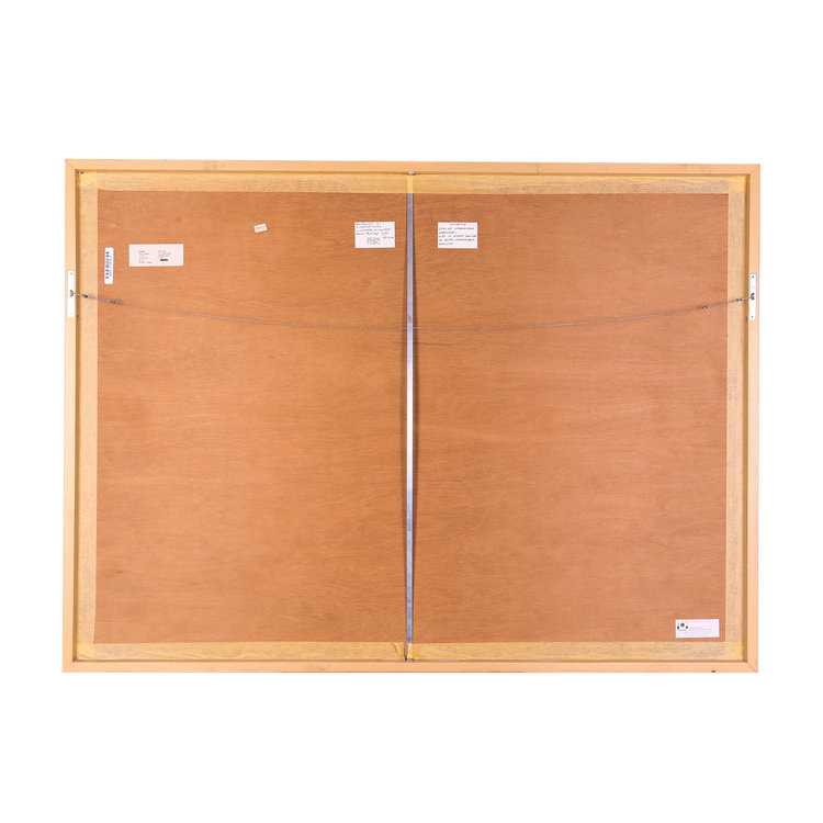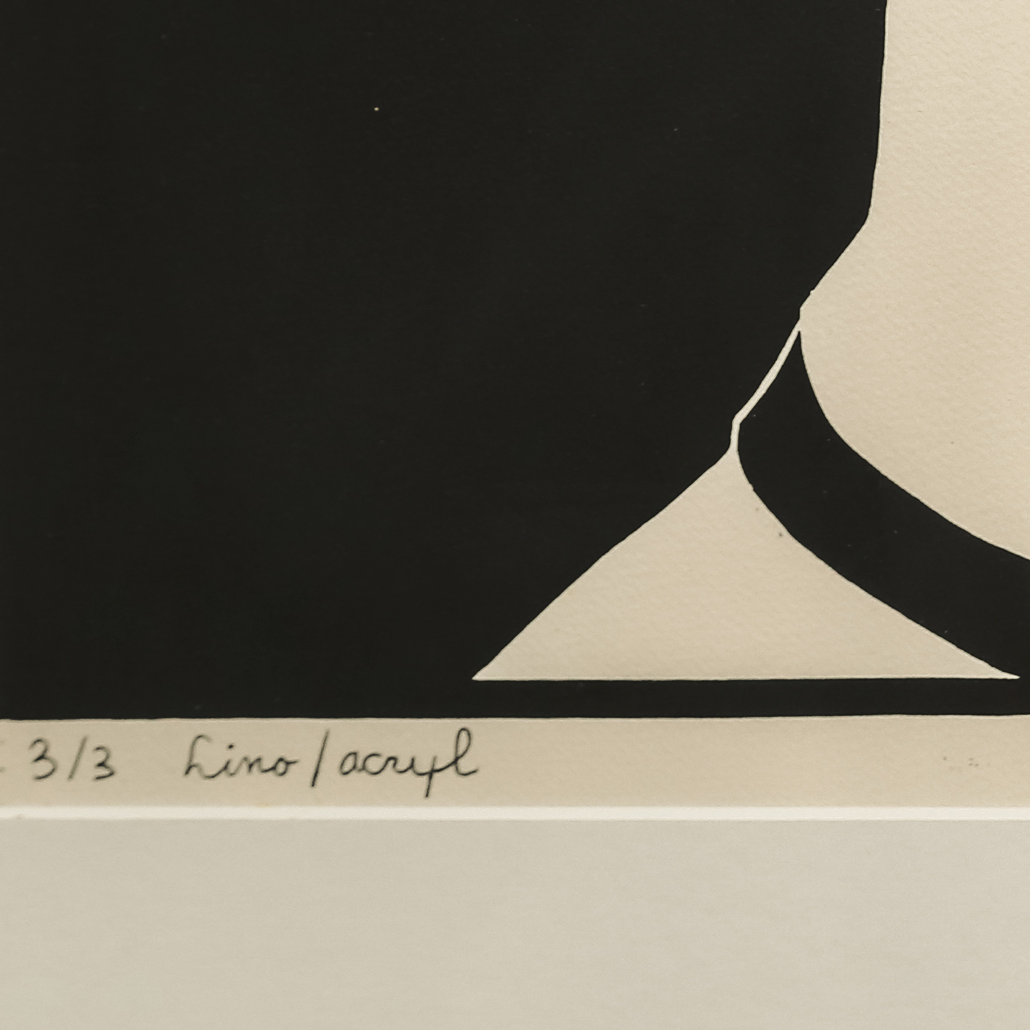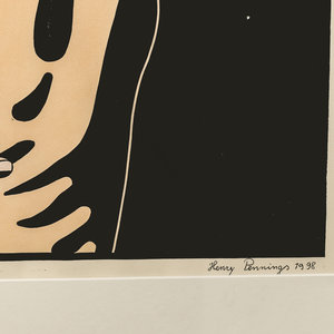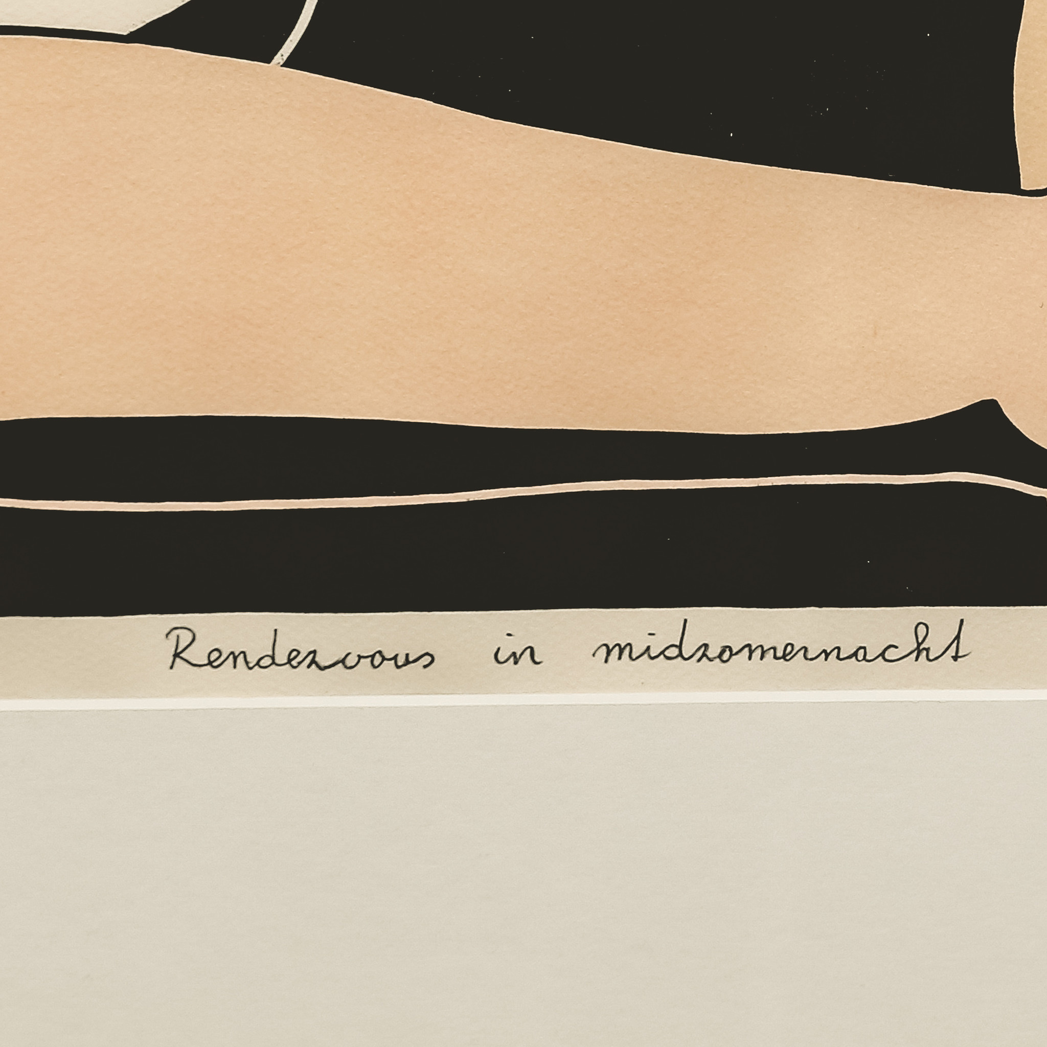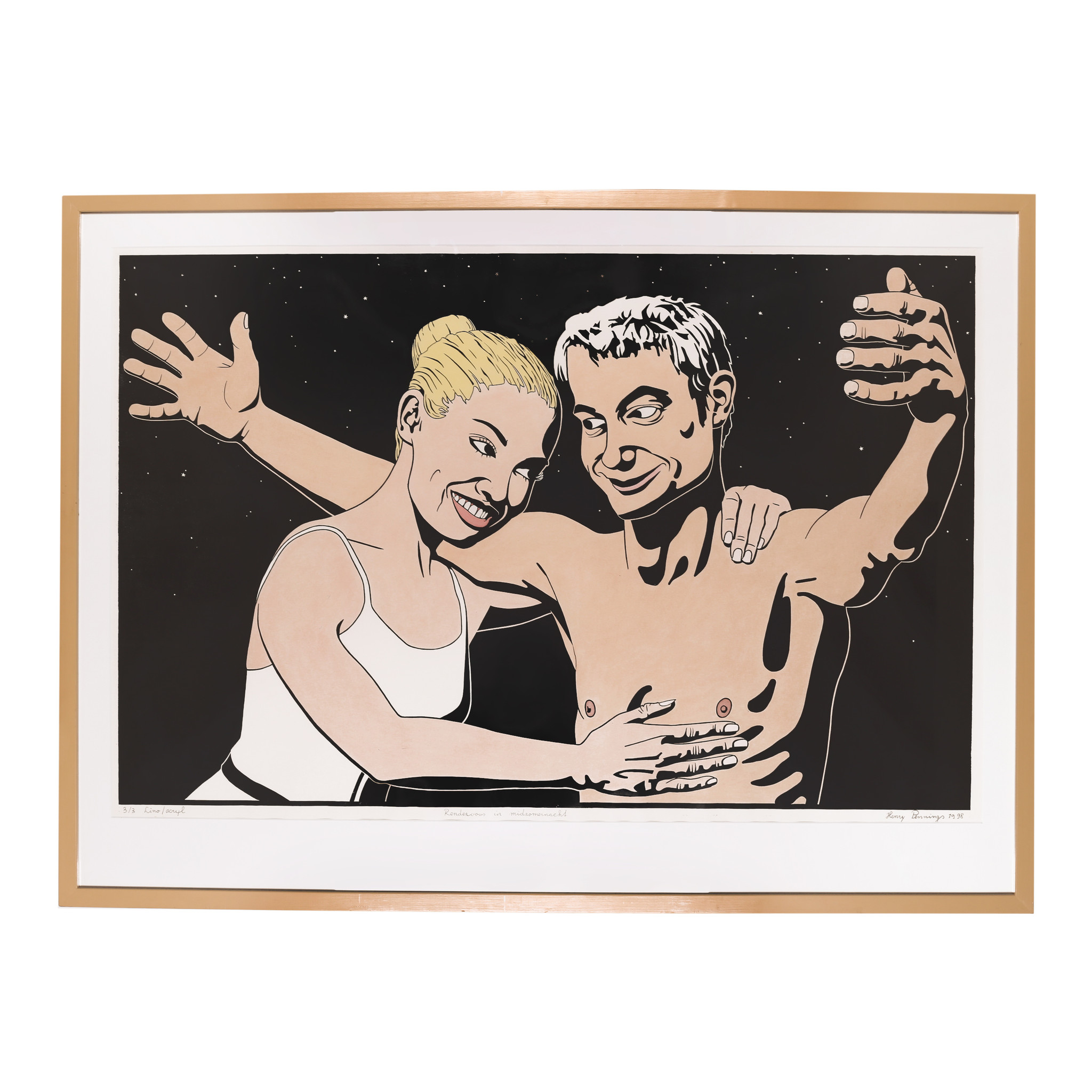 Henry Pennings, Rendezvous in midzomernacht, 1998. Linodruk met acryl op papier in houten lijst, oplage 3/3. Portret van een man en een vrouw die elkaar omarmen voor een donkere achtergrond. Linksonder oplagenummer en techniek, in midden titel en rechtsonder signatuur en jaartal. Conditie: goed, gebruikssporen aan lijst. Afmeting werk zonder lijst: 78 x 119 cm.