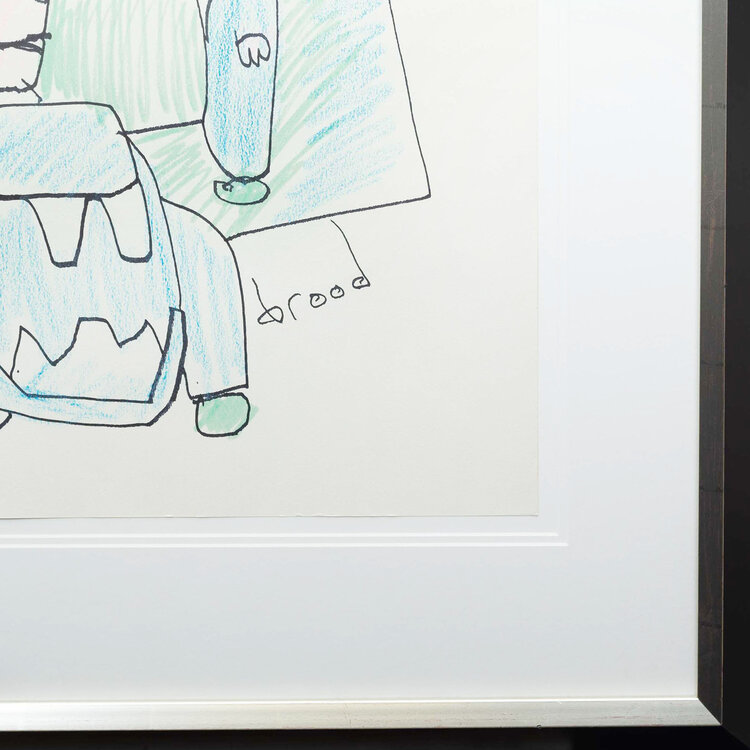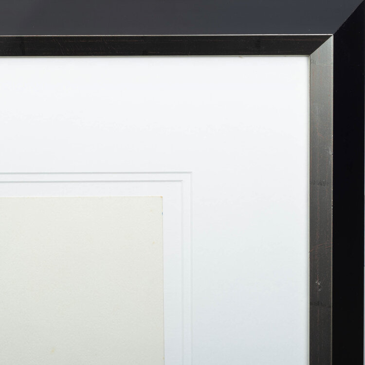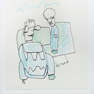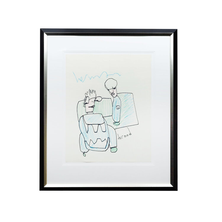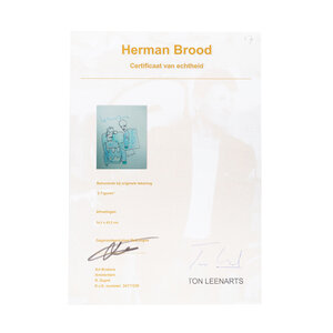 Herman Brood, '2 figuren', jaartal onbekend. Gemengde techniek op papier in zwart met zilver kleurige lijst. Afbeelding van twee mannen in blauw voor een groen kader. Bovenin gesigneerd in blauw 'herman' en rechtsonder 'brood'. Het werk is ingelijst met dubbel passe-partout achter Tegla UV werend Galerieglas. Een certificaat van echtheid wordt meegeleverd. Conditie: goed. Afmetingen tekening: 65,5 x 43,5 cm, lijst: 82 x 70 cm.