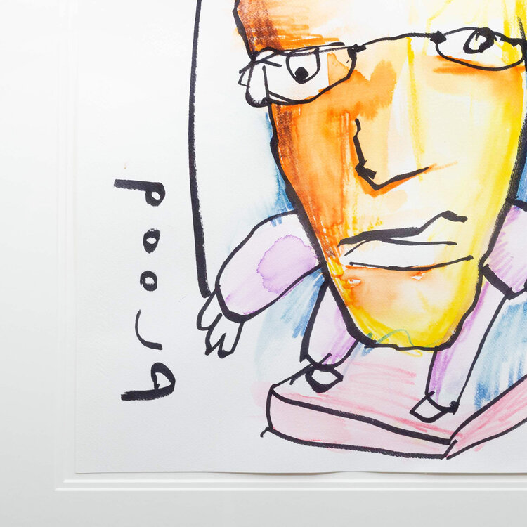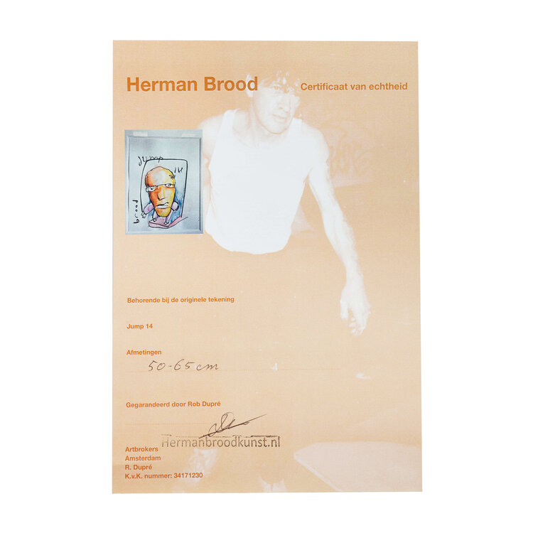 Herman Brood, 'Jump 14', jaartal onbekend. Tekening met marker op papier in zwart met zilverkleurige lijst. Portret van een man met bril in een blauw kader. Bovenin staat 'jump 14' of 'jump IK' en linksonder gesigneerd met 'brood'. Het werk is ingelijst met dubbel passe-partout achter museumglas. Een certificaat van echtheid is bijgeleverd. Conditie: goed. Afmetingen tekening: 65 x 50 cm, lijst: 91 x 75 cm.