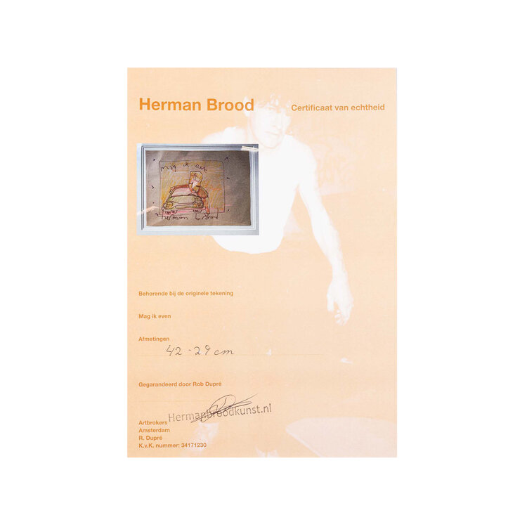 Herman Brood, 'Mag ik even', jaartal onbekend. Tekening met marker op papier in zwart met zilver kleurige lijst. Afbeelding van een man met een groene auto in een geel kader. Onderin gesigneerd met 'herman brood'. Een certificaat van echtheid wordt meegeleverd. Conditie: goed. Afmetingen tekening: 29 x 42 cm, lijst: 65,5 x 72,5 cm.