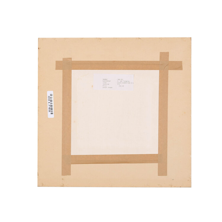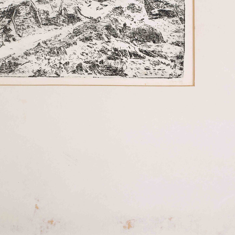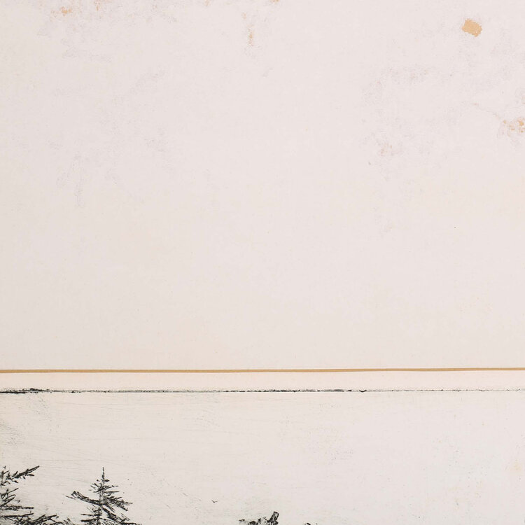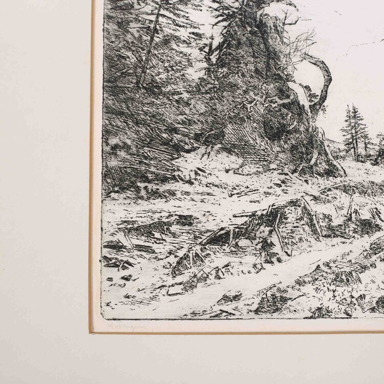 Herman van Tongeren, Grote Boomstronk, 1969. Ets in wit passe-partout. Afbeelding van een paadje over een heuvel met daarnaast een boomstronk en naaldbomen. Conditie: beschadigingen aan de passepartout, maar werk is in goede conditie. Afmeting werk: 18 x 19 cm.