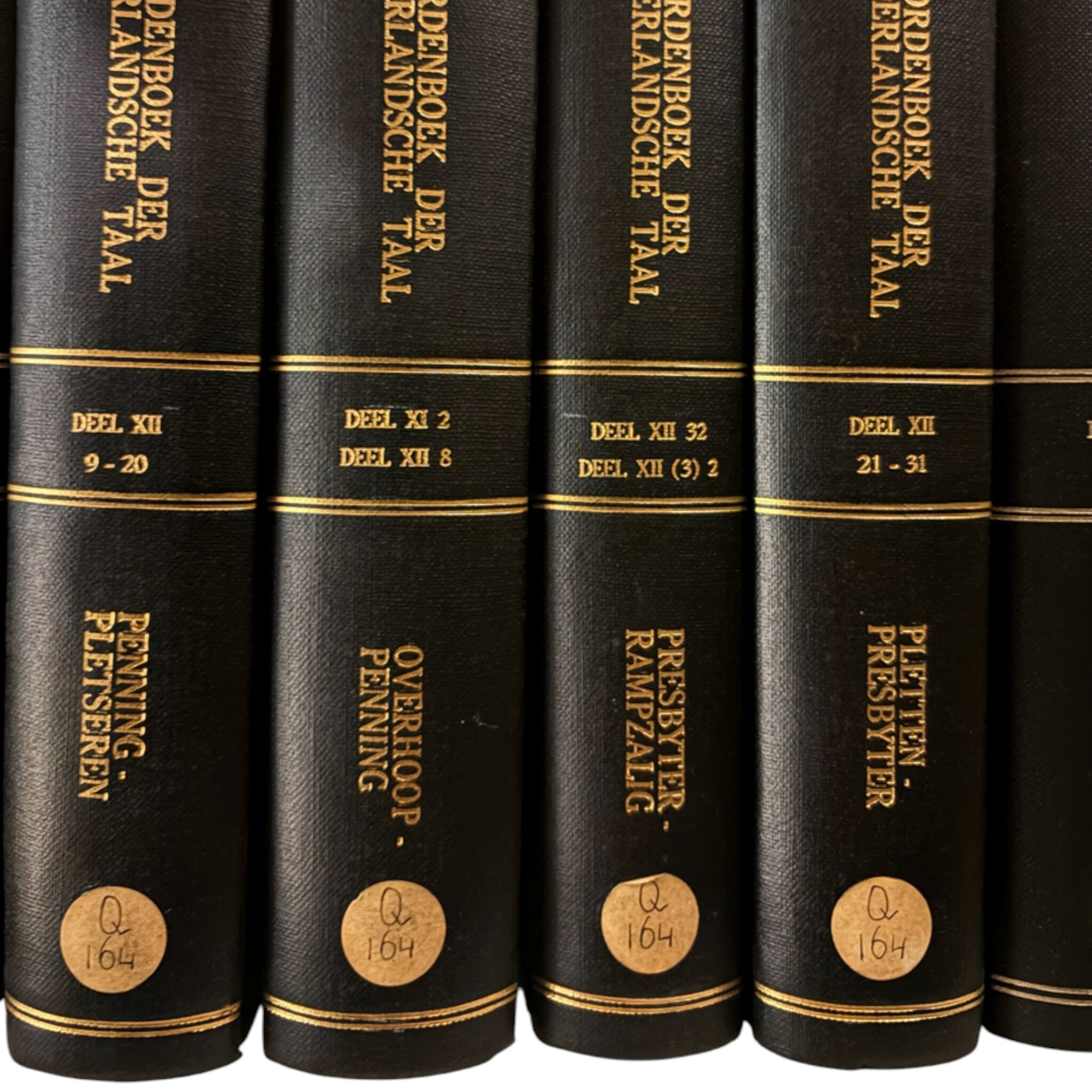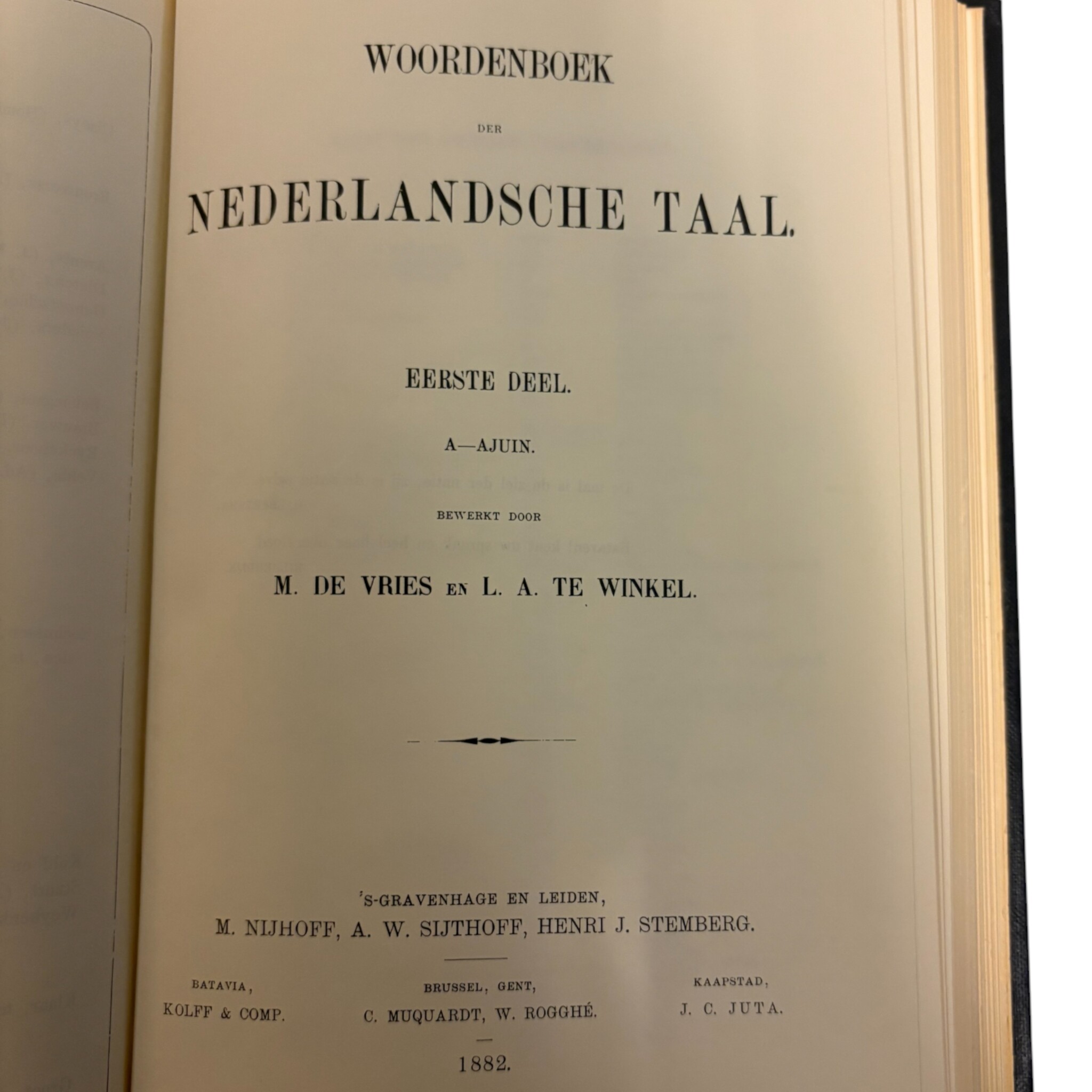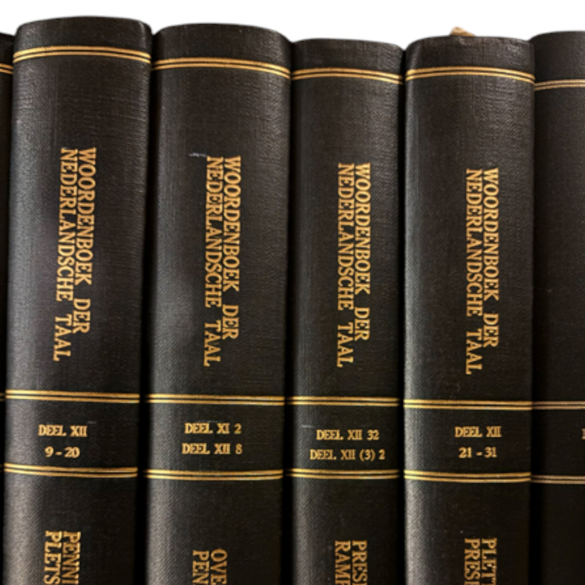 Het Woordenboek der Nederlandsche Taal (WNT), 63 boeken. De delen lopen van I t/m XXIX (1 t/m 29). Er ontbreken twee delen: Deel XXII 1-10 en Deel XXIII 13-20. Er zijn uitgaven uit: 1882, 1900, 1916, 1918, 1924, 1926, 1949, 1958, 1960, 1971, 1979, 1986, 1989, 1991, 1993, 1994, 1996 en 1998. Uitgegeven door: 1882 M. Nijhoff, A.W. Sijthoff, Henri J. Stemberg; 1900-1971 M. Nijhoff, A.W. Sijthoff; 1979-1989 M. Nijhoff; 1991 M. Nijhoff, SDU Uitgeverij; 1993-1998 SDU Uitgeverij. In 1851 presenteerde Matthias de Vries zijn ontwerp voor een ‘volledig Nederduitsch taalkundig woordenboek’. Sindsdien hebben er vijf generaties redacteuren bijna anderhalve eeuw aan gewerkt. Het ‘Woordenboek der Nederlandsche Taal’ is het grootste historische woordenboek ter wereld. Het beschrijft de betekenis en geschiedenis van honderdduizenden woorden. Conditie: de boeken vertonen gebruikssporen. De afmetingen variëren van: H. 26-27 cm; B. 17,5-18,5 cm; D. 2,5-6,5 cm.
