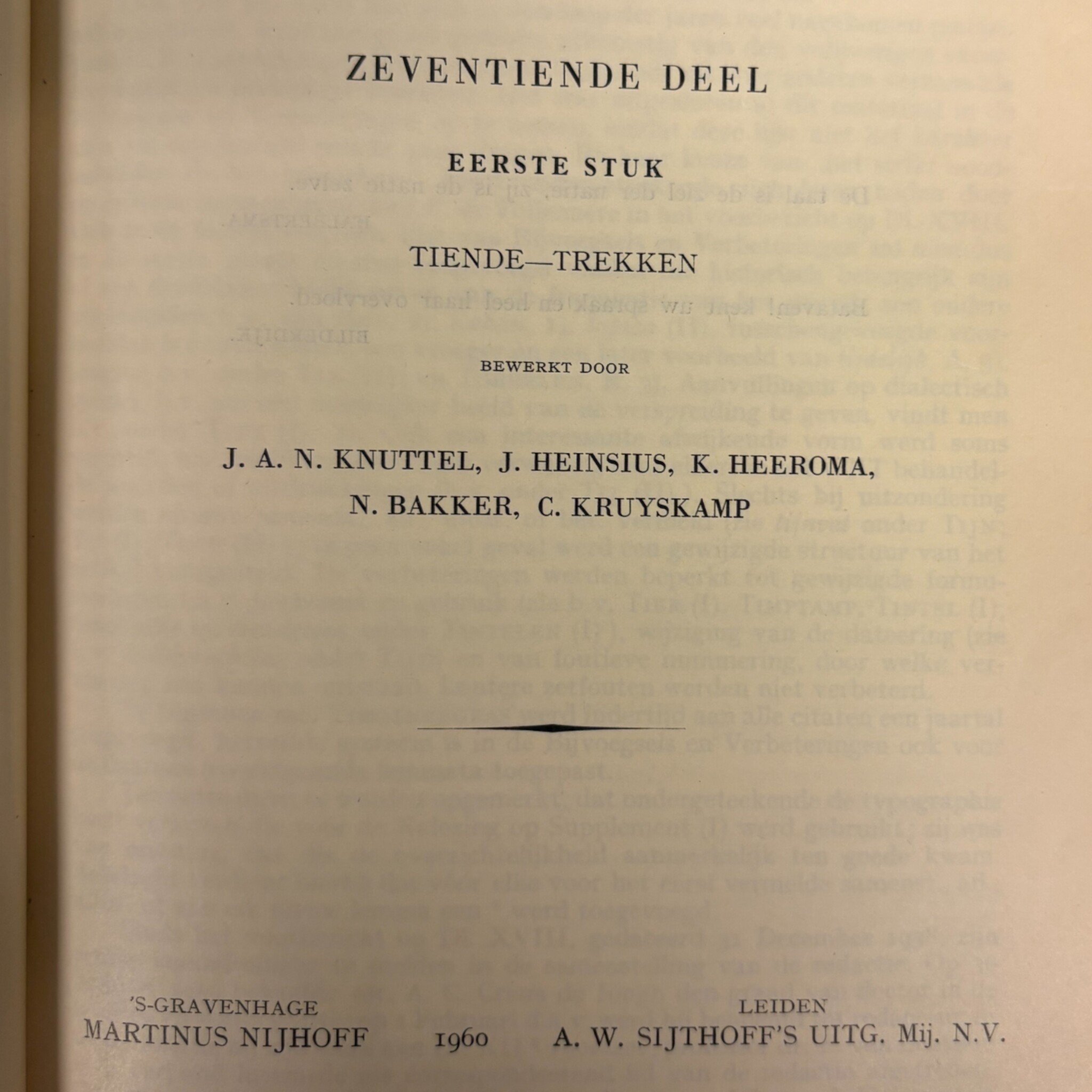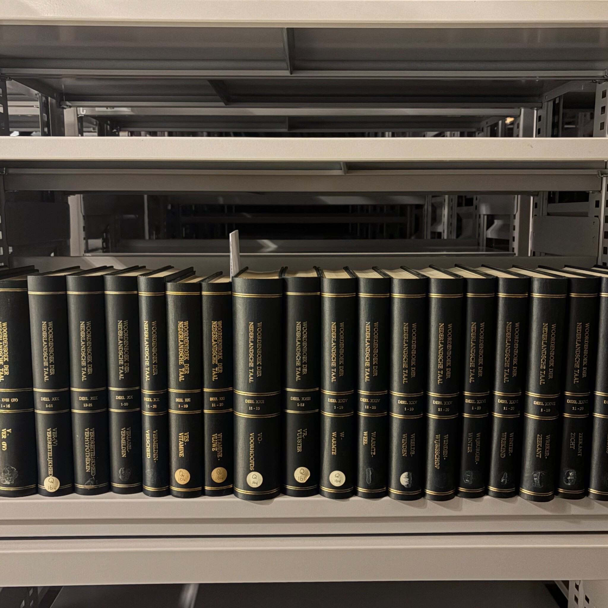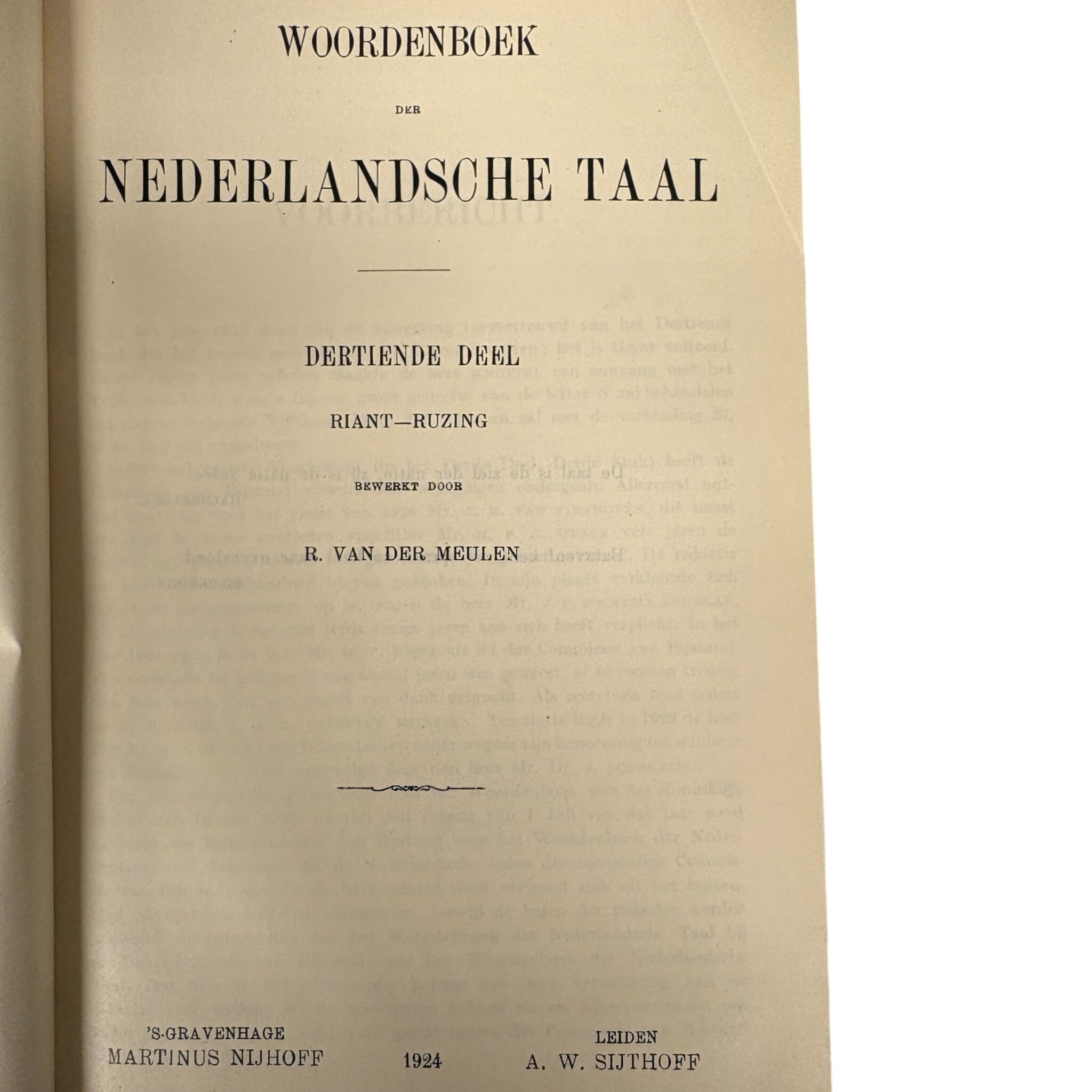 Het Woordenboek der Nederlandsche Taal (WNT), 63 boeken. De delen lopen van I t/m XXIX (1 t/m 29). Er ontbreken twee delen: Deel XXII 1-10 en Deel XXIII 13-20. Er zijn uitgaven uit: 1882, 1900, 1916, 1918, 1924, 1926, 1949, 1958, 1960, 1971, 1979, 1986, 1989, 1991, 1993, 1994, 1996 en 1998. Uitgegeven door: 1882 M. Nijhoff, A.W. Sijthoff, Henri J. Stemberg; 1900-1971 M. Nijhoff, A.W. Sijthoff; 1979-1989 M. Nijhoff; 1991 M. Nijhoff, SDU Uitgeverij; 1993-1998 SDU Uitgeverij. In 1851 presenteerde Matthias de Vries zijn ontwerp voor een ‘volledig Nederduitsch taalkundig woordenboek’. Sindsdien hebben er vijf generaties redacteuren bijna anderhalve eeuw aan gewerkt. Het ‘Woordenboek der Nederlandsche Taal’ is het grootste historische woordenboek ter wereld. Het beschrijft de betekenis en geschiedenis van honderdduizenden woorden. Conditie: de boeken vertonen gebruikssporen. De afmetingen variëren van: H. 26-27 cm; B. 17,5-18,5 cm; D. 2,5-6,5 cm.