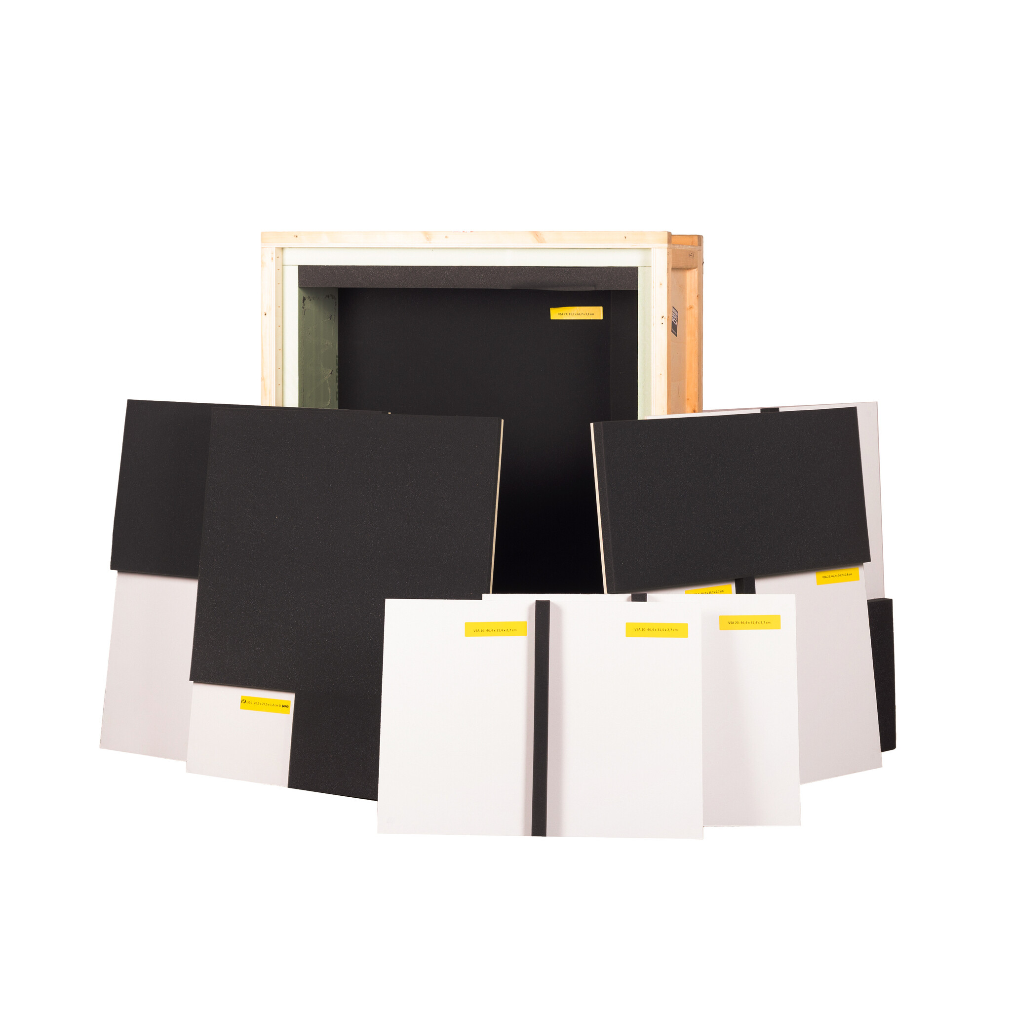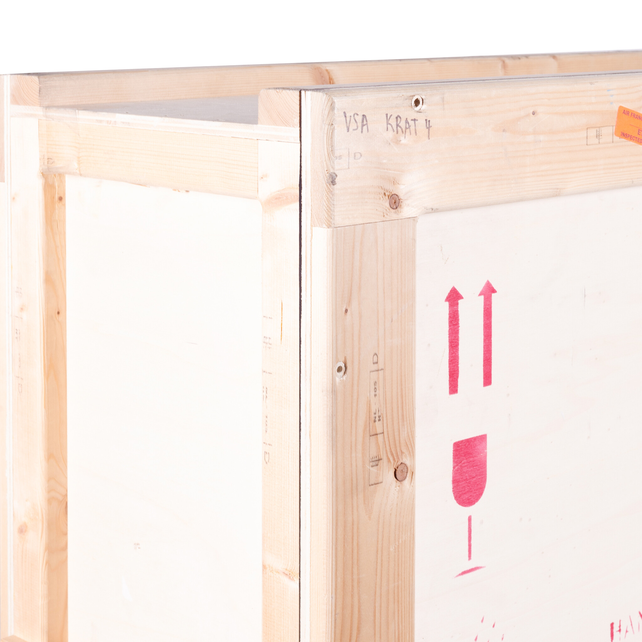 Houten kist voor kunsttransport, 21ste eeuw. De wanden zijn aan de binnenkant bekleed met schuim. In de kist zitten schotten met schuim. De kist is gebruikt door het Nederlands Fotomuseum in Rotterdam voor het veilig vervoeren van collectiemateriaal. Conditie: gebruikt, de deksel zit met 4 schroeven vast. Afmetingen: buitenmaat ca. 107 x 100 x 42,5 cm; binnenmaat ca. 82 x 83 x 24 cm.