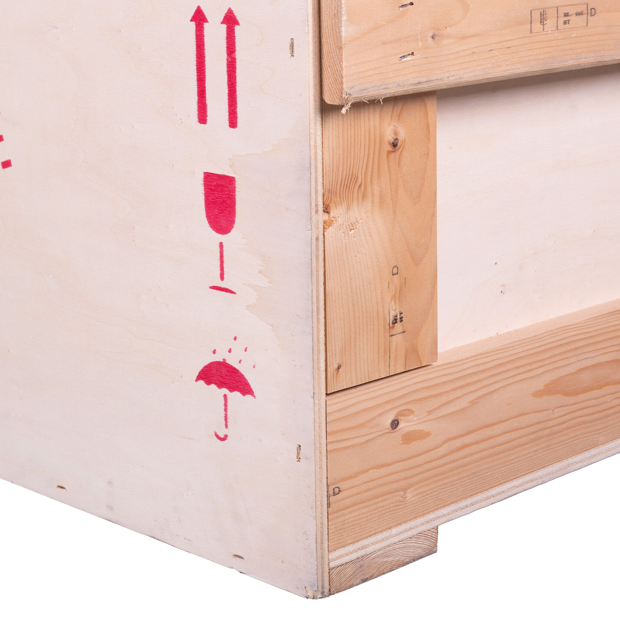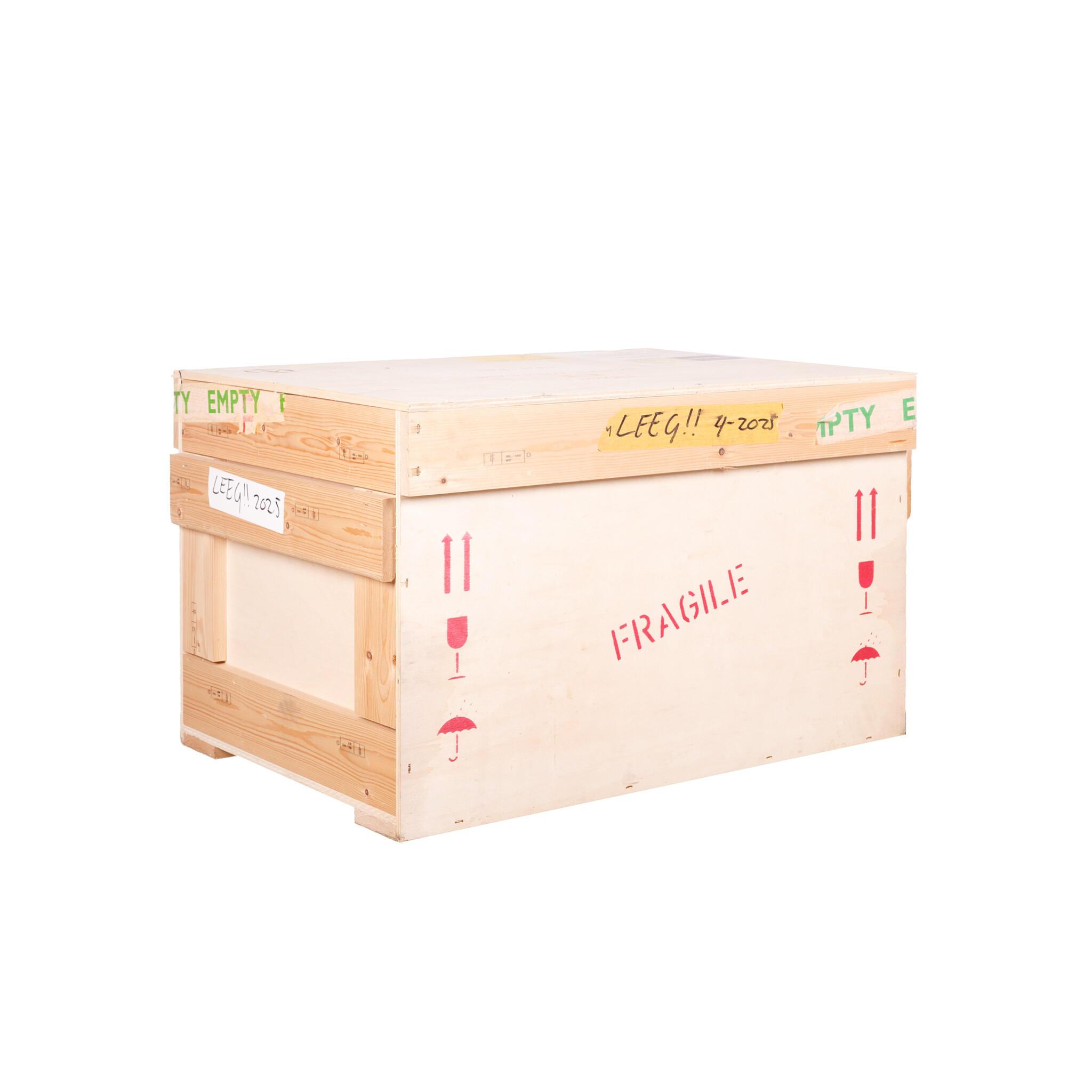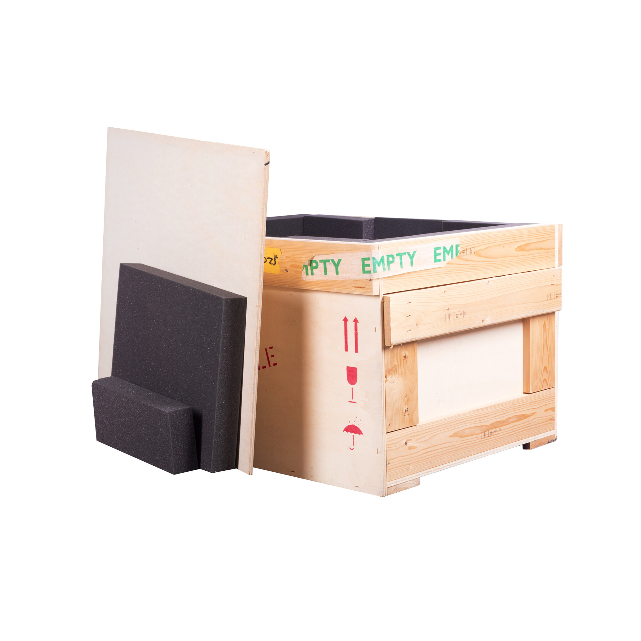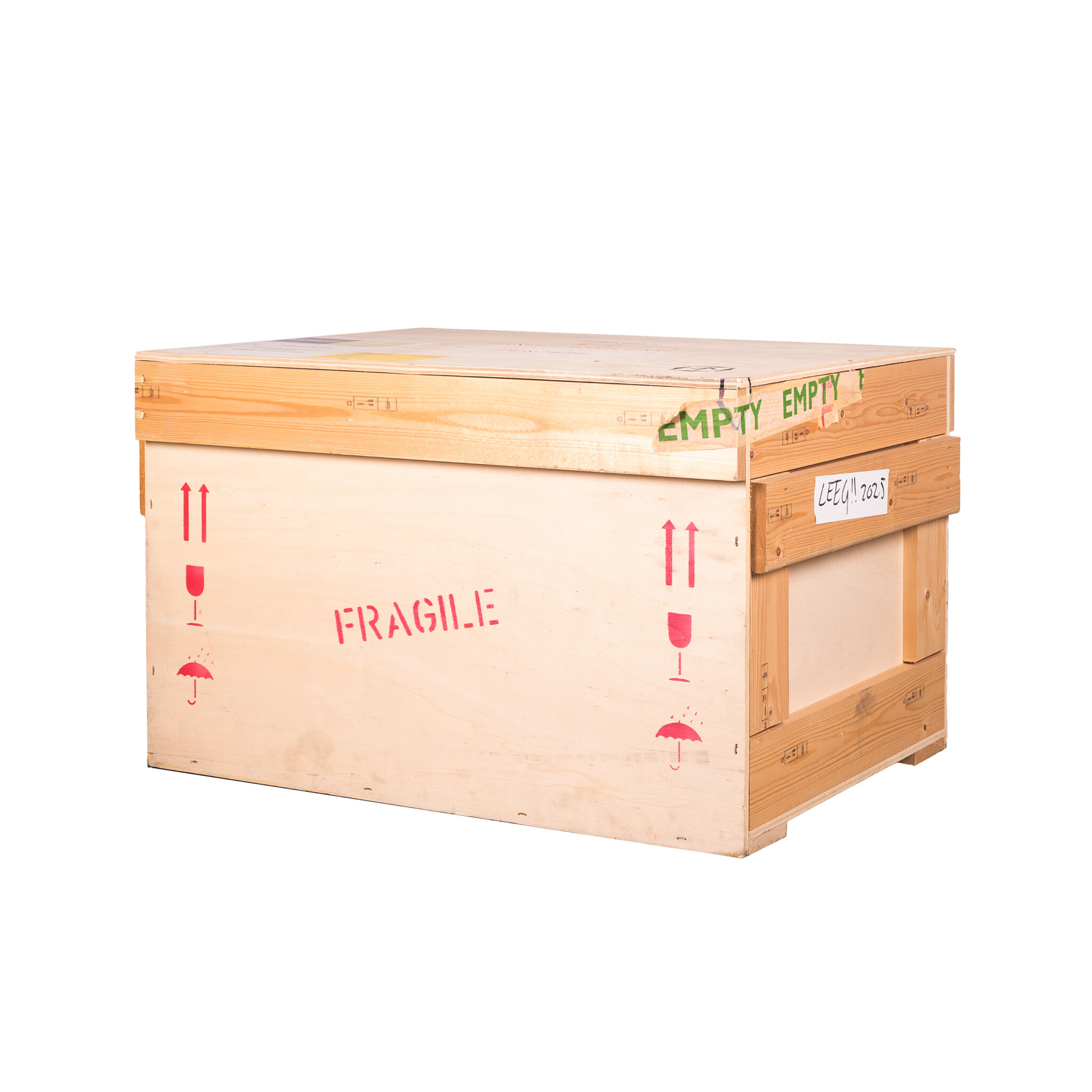 Houten kist voor kunsttransport, 21ste eeuw. De wanden zijn aan de binnenkant bekleed met schuim. Los in de kist zit een schot en twee stukken schuim. De kist is gebruikt door het Nederlands Fotomuseum in Rotterdam voor het veilig vervoeren van collectiemateriaal. Conditie: gebruikt. Afmetingen: buitenmaat ca. 49 x 82 x 61 cm; binnenmaat ca. 40 x 64 x 45 cm.