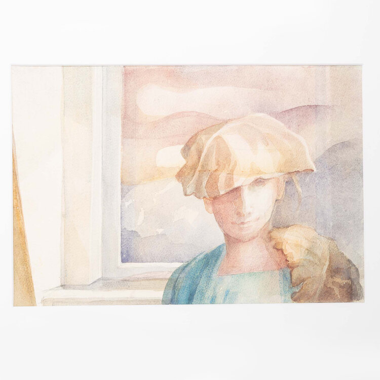 Ineke Ebbinge, 'Bezinning', datering onbekend. Aquarel op papier in houten lijst. Portret van een figuur met kort haar voor een venster. Conditie: goed, hooguit lichte gebruikssporen aan lijst. Afmetingen lijst: 55 x 62 cm; beeldvlak: 22 x 33 cm.