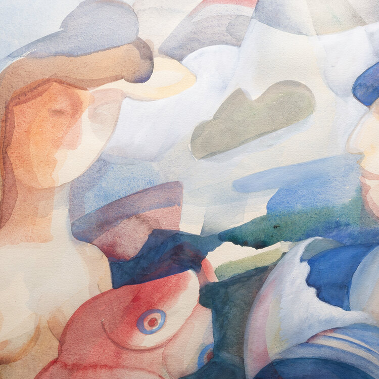 Ineke Ebbinge, 'De matrozen en het nieuwe meisje'. Aquarel op papier in metalen lijst met passe-partout. Afbeelding van een naakte vrouw met twee mannen in matrozenpak. Signatuur waarschijnlijk onder passe-partout. Datering: 1986. Conditie: papier is gezakt, vlekken op passe-partout, gebruikssporen lijst. Afmetingen lijst: 70,5 x 80,5 cm; beeldvlak: 42 x 52 cm.