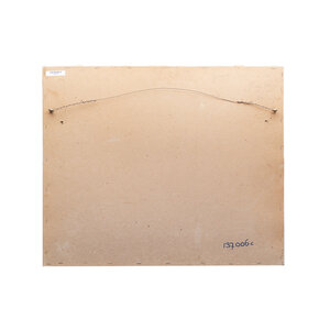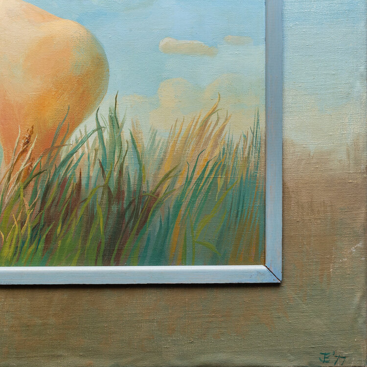 Ineke Ebbinge, 'Geboorte, Leven en Dood (2/3)', 1977. Olieverf op doek zonder lijst. Surrealistische afbeelding van een bot dat boven een grasveld uitsteekt. Op het werk is een lijst geplakt. Signatuur rechtsonder. Conditie: kleine beschadigingen aan de randen. Afmetingen: 54 x 64,5 cm.