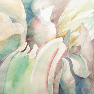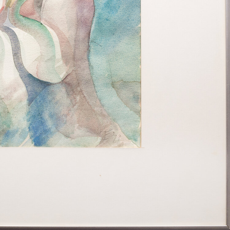 Ineke Ebbinge, 'Mensen en natuur II', 1979. Aquarel op papier in metalen lijst. Abstracte compositie van een figuur in natuurlijke omgeving. Signatuur rechtsonder. Conditie: werk is in goede staat, passe-partout is wat vuil. Afmetingen lijst: 60 x 70 cm; beeldvlak: 39 x 44 cm.