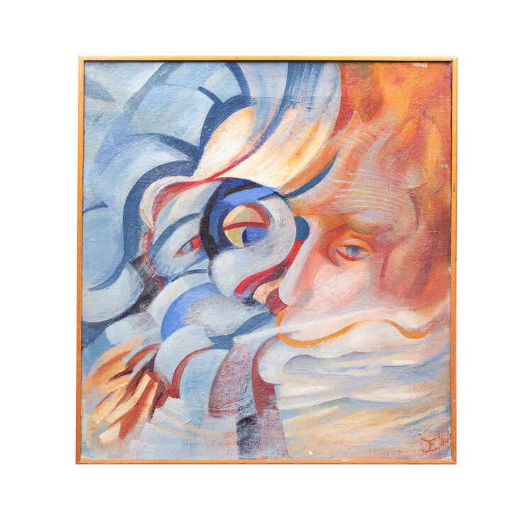 Ineke Ebbinge, 'Oude en nieuwe mens', 1984. Olieverf op doek in houten lijst. Abstracte compositie in blauw en rood; in het midden links en rechts een oog. Signatuur rechtsonder. Conditie: op een aantal plekken verfverlies en lijst toont gebruikssporen. Afmetingen lijst: 66 x 61 cm.