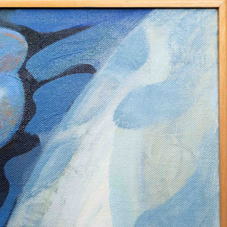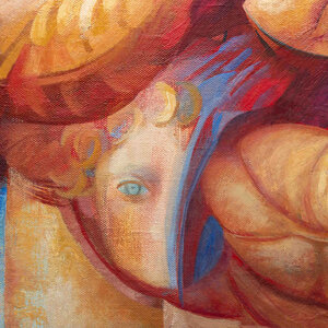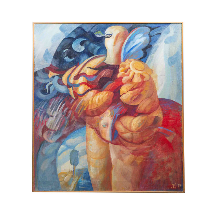 Ineke Ebbinge, 'Wat blijft voor onze kinderen?', 1984. Olieverf op doek in houten lijst. Surrealistische afbeelding van een figuur met een gezicht op de buik. Signatuur rechtsonder. Conditie: goed. Afmetingen incl. lijst: 101 x 91 cm.