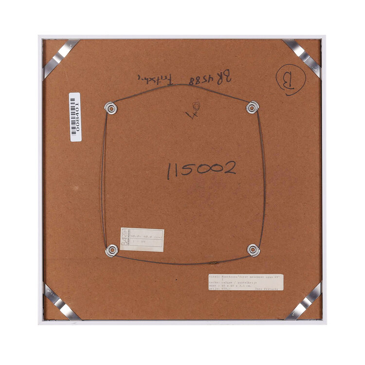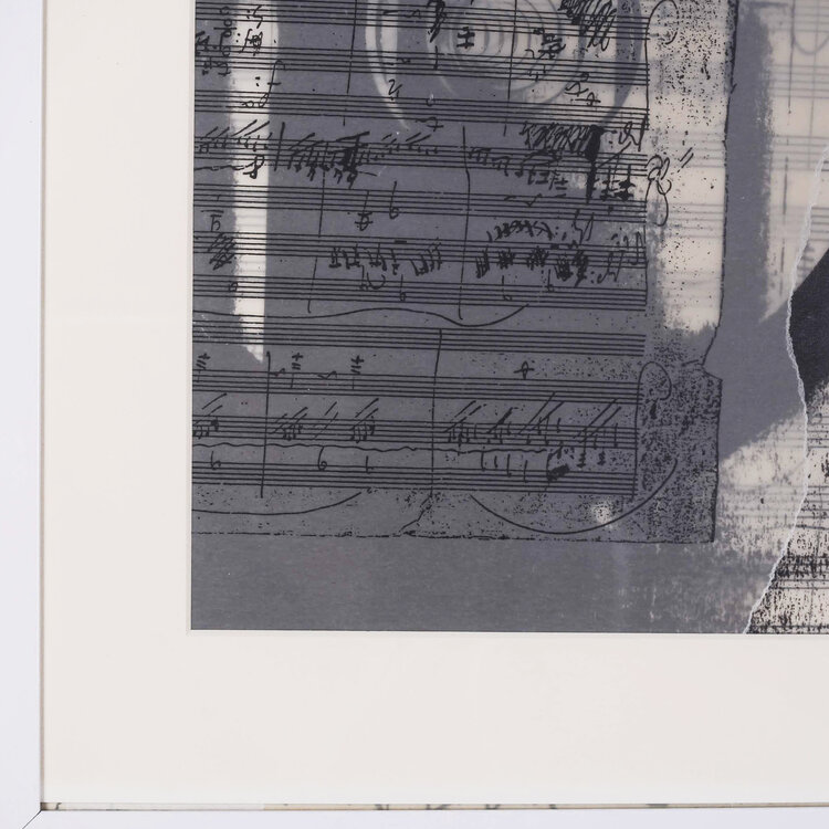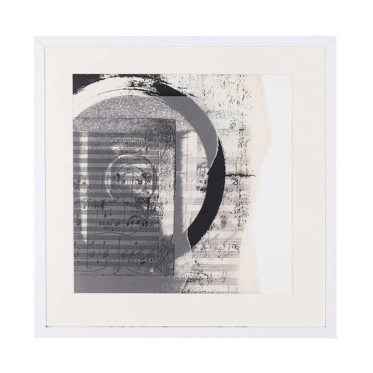 Inez Fritschy, Beethoven: first movement opus 69 I, jaartal onbekend. Gemengde techniek op papier in witte lijst. Collectie bladmuziek op kalkpapier in lijst met op de achtergrond een vel met zwarte cirkel. Signatuur rechtsonder. Conditie: goed, gebruikssporen aan lijst. Afmetingen lijst. 40 x 40 cm.
