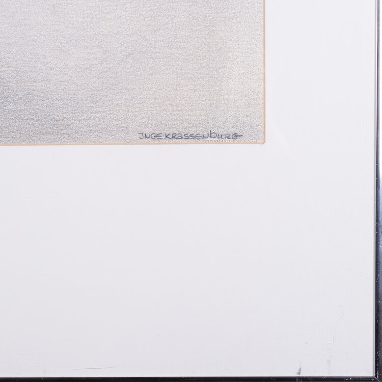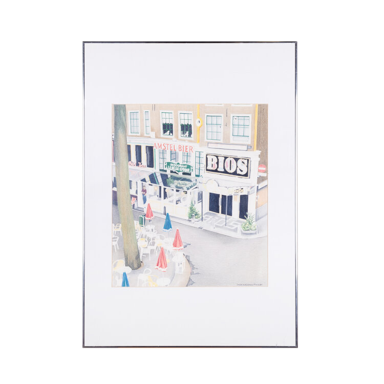 Inge Krassenburg, Leidseplein, A'dam. Datering onbekend. Kleurpotlood op papier in metalen lijst met passe-partout. Realistische afbeelding van cafés met terrasjes en een bios aan het Leidseplein. Conditie: gebruikssporen op lijst, zoals krassen. Afmeting incl. lijst: 100,5 x 70,5 cm.