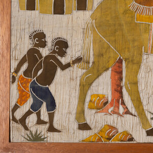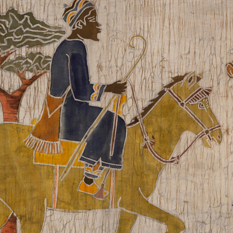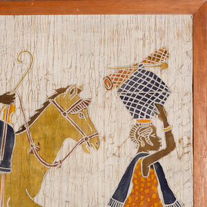 Een wandkleed met een scène van een man te paard, een vrouw die voor het paard staat en twee kinderen erachter. Het doek is ingelijst in een houten lijst zonder glas. Datering: ca. 1996. Conditie: het kleed is in goede staat, de lijst toont gebruikssporen. Afmetingen ca. 70 x 95,5 cm.